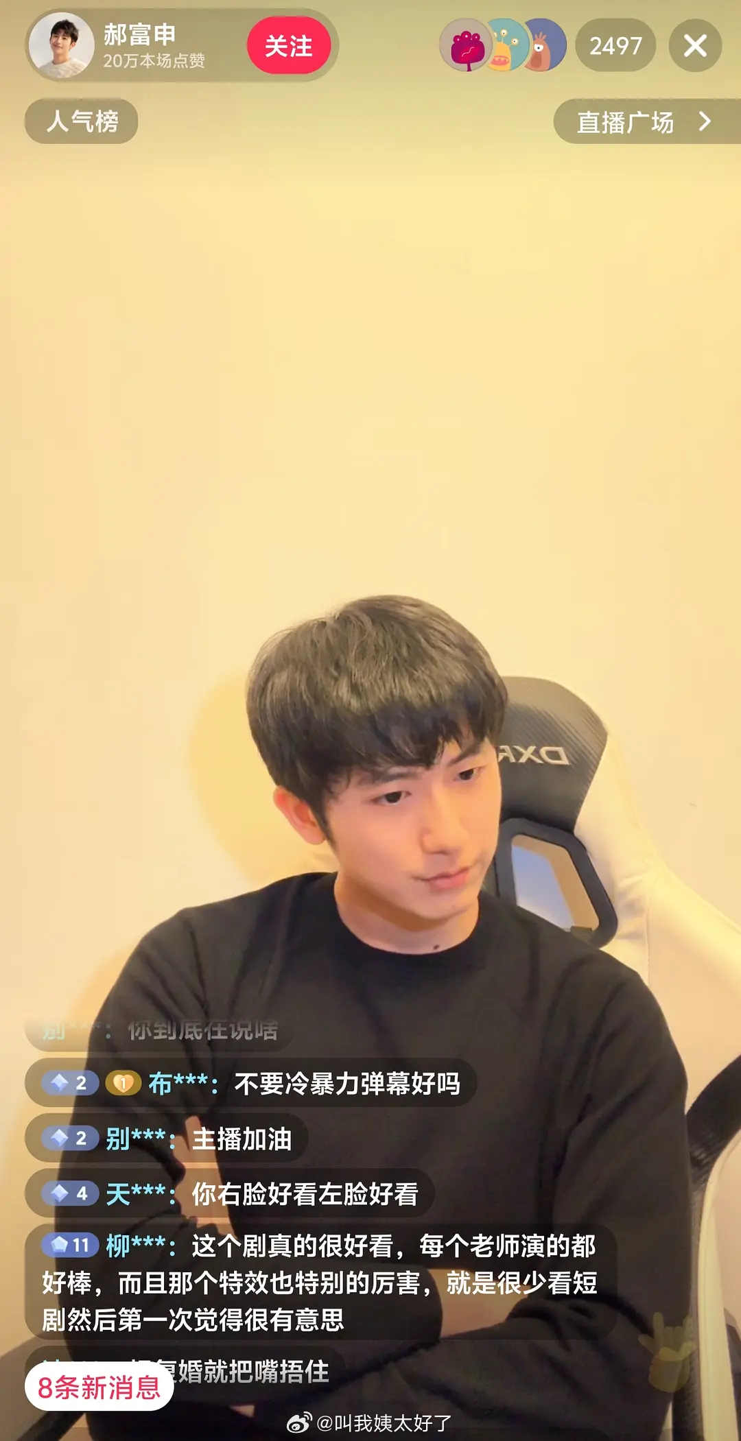 哈哈哈哈郝富申直播太好笑了,弹幕里面全是CP粉在贴脸,找半天也找不出一条评论回复。贡献榜也是CP粉霸榜。后面开始直接自己编弹幕回答问题🙉🙉🙉