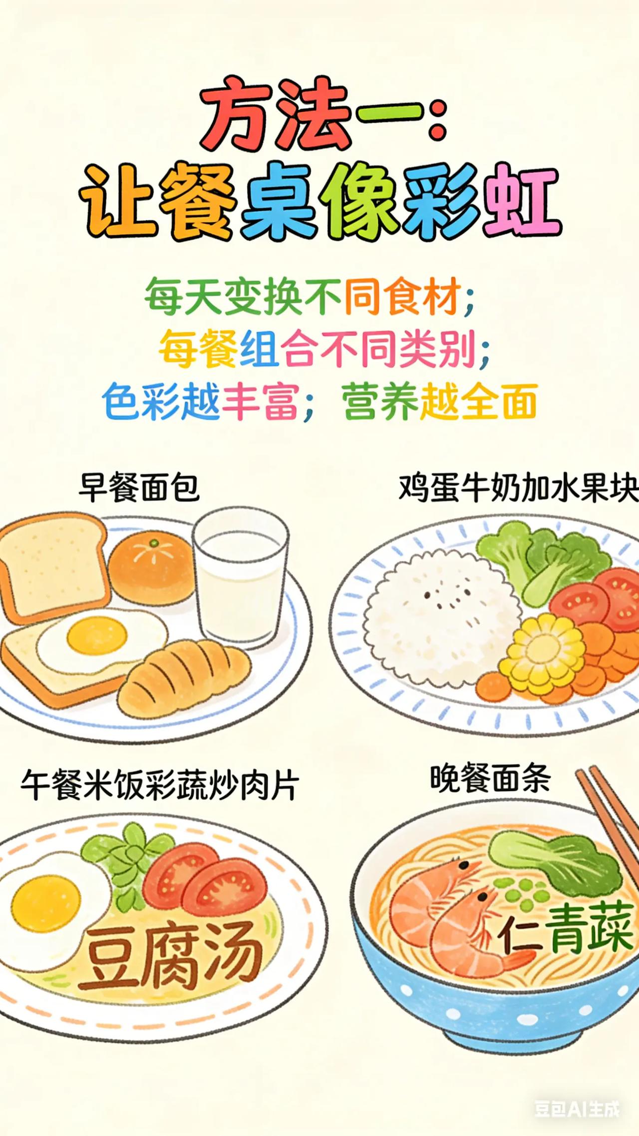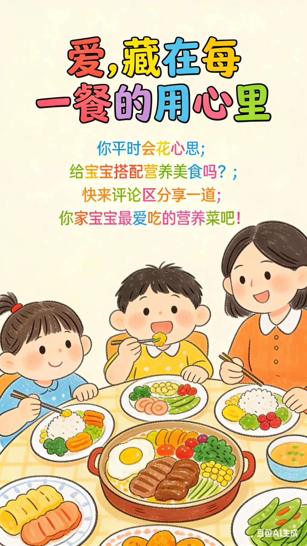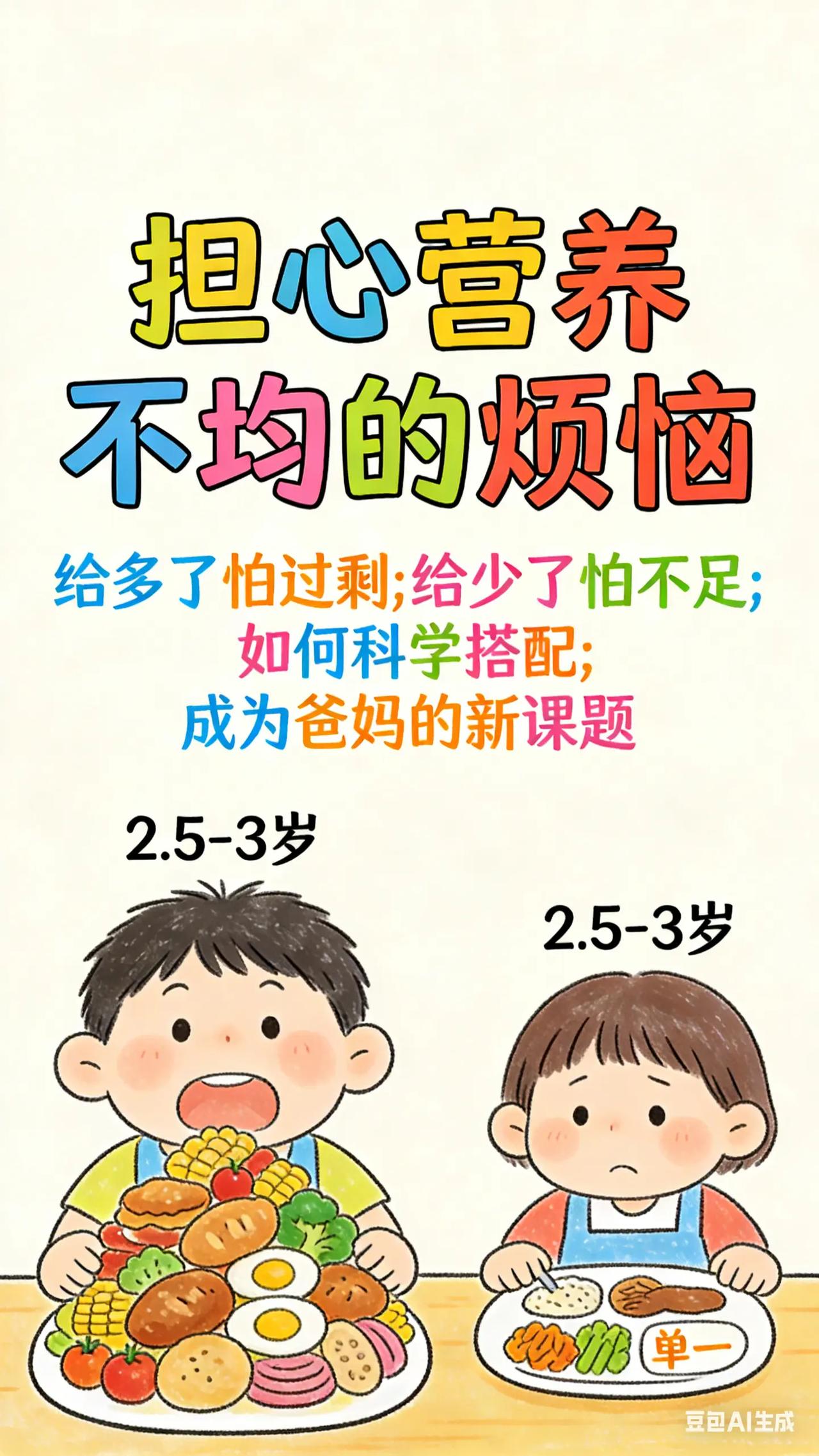 0-3岁喂养与饮食:9.营养搭配吃得更棒。宝宝 2.5 - 3 岁,家长想让宝宝饮食更均衡,但面对众多食物种类,不知道如何搭配,担心宝宝营养过剩或不足,影响宝宝健康成长。科学原理这个阶段宝宝生长发育迅速,需要全面均衡营养。饮食应包括谷类、蔬菜、水果、蛋白质类食物(如肉类、豆类、蛋类)以及适量的奶制品。合理的营养搭配能提供宝宝所需能量、维生素、矿物质等,促进身体和大脑发育。具体方法食物多样化搭配:每天安排不同种类食物,如早餐可搭配面包、鸡蛋、牛奶和水果;午餐有米饭、蔬菜炒肉、豆腐汤;晚餐吃面条、虾仁蔬菜等。保证每餐有谷类提供能量,蔬菜和水果提供维生素和膳食纤维,蛋白质类食物促进生长发育。控制食物量:根据宝宝年龄和活动量,合理控制食物量。避免过度喂养导致肥胖,也不要让宝宝因进食不足影响生长。例如,2.5 - 3 岁宝宝每餐谷类食物量约 50 - 100 克,肉类 25 - 50 克等。常见误区误区一:过度依赖保健品补充营养。通过合理饮食,宝宝通常能获取足够营养,过多依赖保健品可能导致某些营养摄入过量,对身体造成负担,应优先保证食物多样化。误区二:忽视食物分量控制。不考虑宝宝实际需求,给宝宝盛过多食物,可能让宝宝产生压力,也易造成浪费,要根据宝宝情况调整食物分量。你平时会花心思给宝宝搭配营养美食吗?分享一道你家宝宝最爱吃的营养菜品。新手妈妈 新手爸妈必看 宝宝吃饭 育儿经验分享
