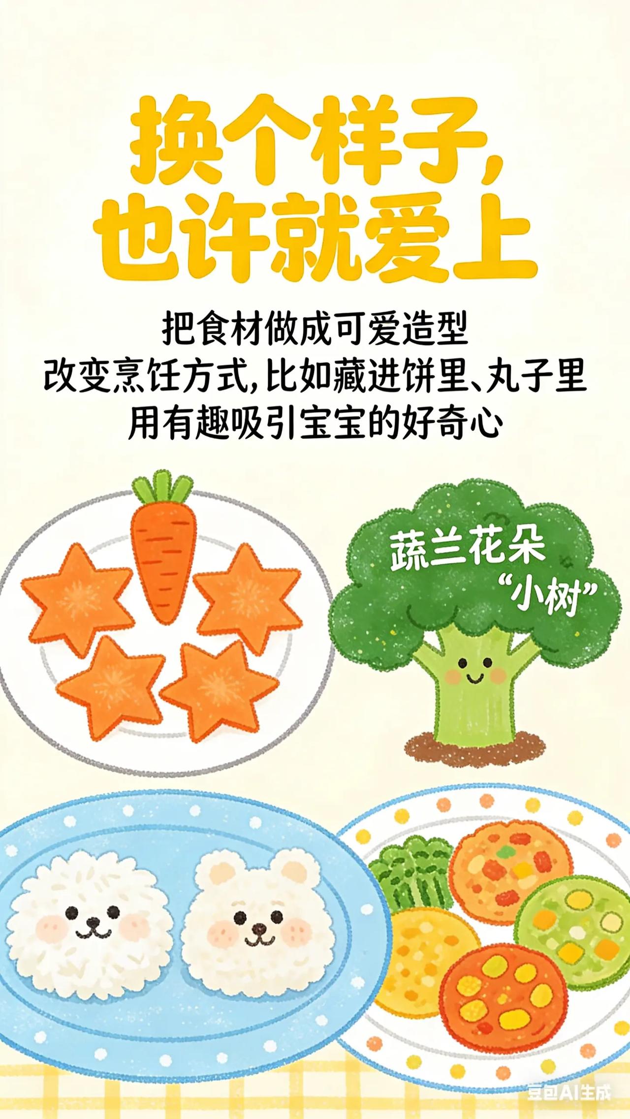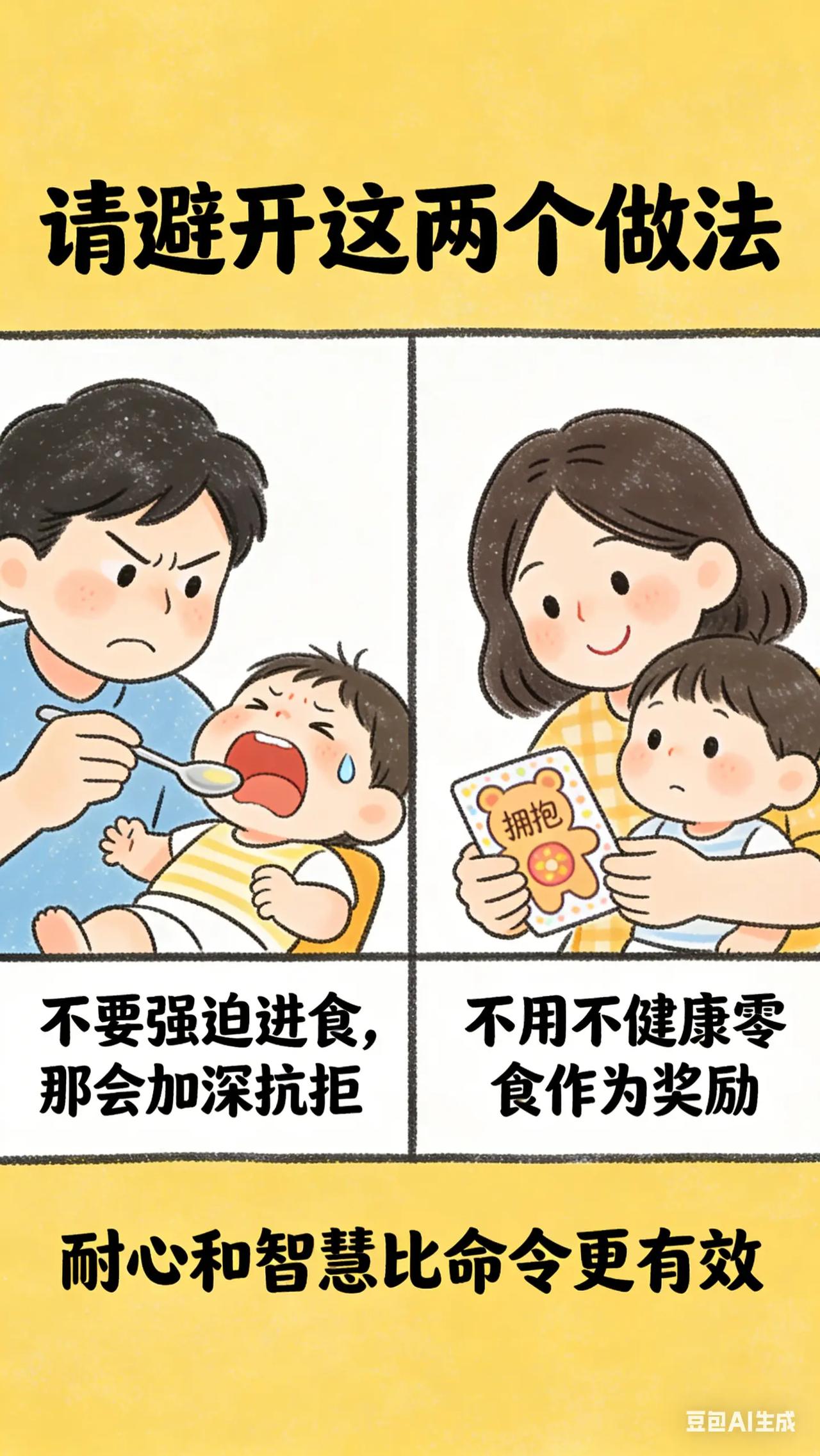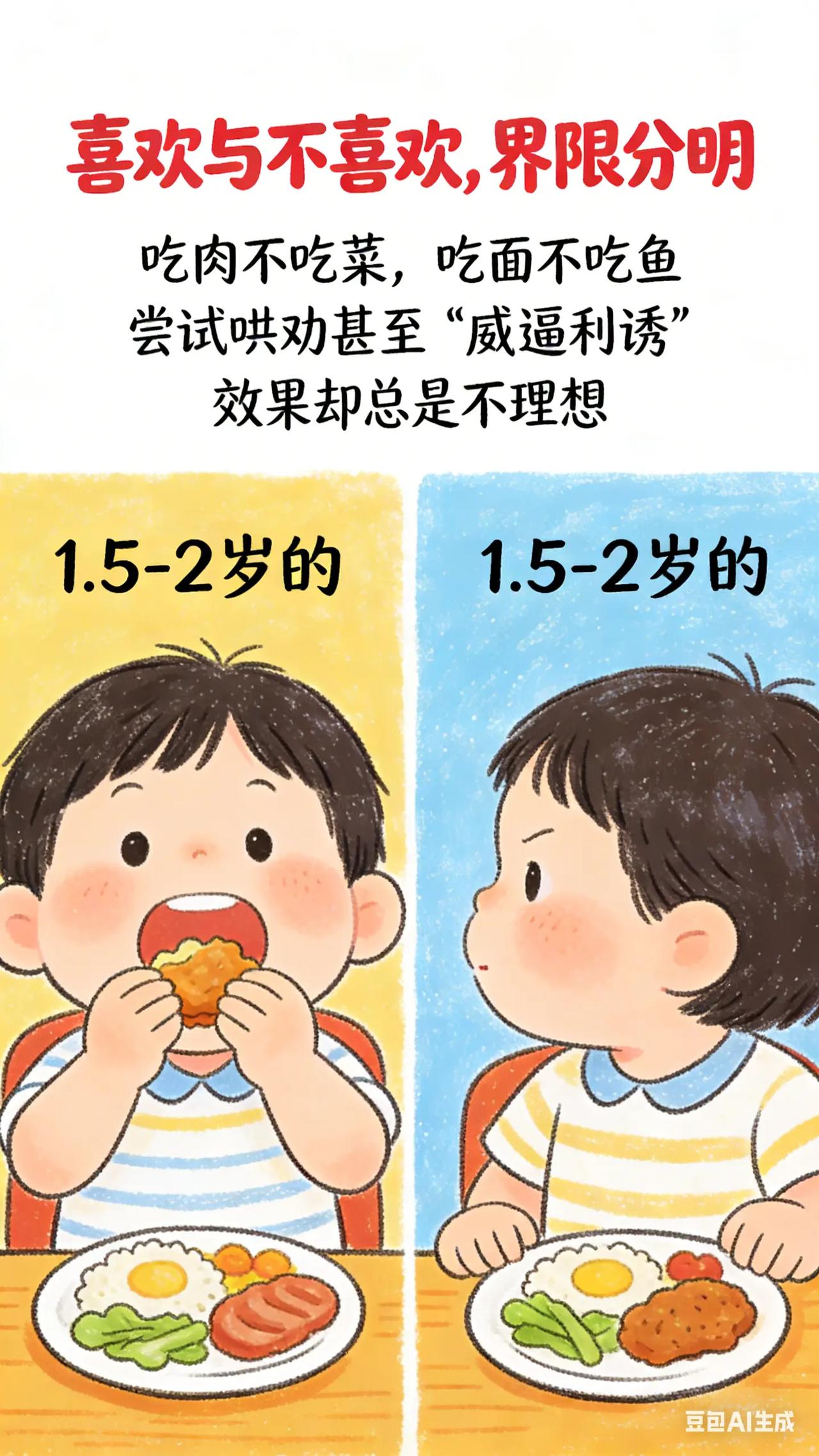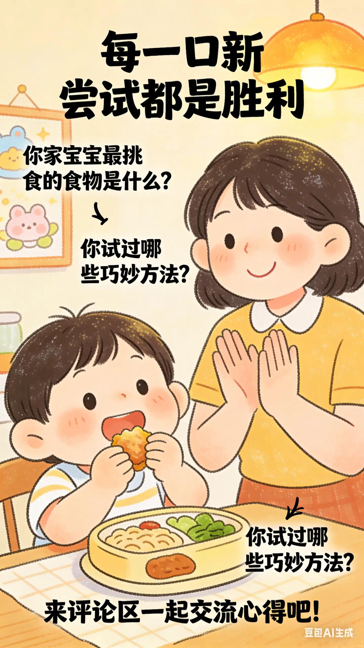 0-3岁喂养与饮食:7.宝宝偏食大作战。宝宝 1.5 - 2 岁,开始出现挑食、偏食现象,喜欢的食物吃很多,不喜欢的碰都不碰,家长担心宝宝营养不均衡,尝试各种方法,如哄骗、强迫,效果都不好,不知如何是好。科学原理此阶段宝宝味觉偏好逐渐形成,对食物的外观、口感和味道更加敏感。挑食偏食可能受多种因素影响,如食物烹饪方式、就餐环境、家长饮食习惯等。长期挑食偏食可能导致营养摄入不足,影响宝宝生长发育。具体方法丰富食物种类与烹饪方式:尝试不同烹饪方法,如将宝宝不喜欢的蔬菜做成蔬菜丸子、蔬菜饼。改变食物外观,如用模具将食物做成可爱形状,增加宝宝对食物的兴趣。以身作则:宝宝会模仿家长饮食习惯,家长要带头吃各种食物,表现出享受食物的样子,潜移默化影响宝宝。同时,不要在宝宝面前抱怨或评价食物不好吃。常见误区误区一:强迫宝宝进食。强迫进食会让宝宝对不喜欢的食物产生厌恶情绪,甚至可能导致进食障碍,应耐心引导,避免强迫。误区二:用零食作为奖励。用零食奖励宝宝吃喜欢的食物,可能让宝宝更依赖零食,且很多零食营养成分单一,不利于宝宝健康,应选择健康的奖励方式,如小贴纸、拥抱等。你家宝宝最挑食的食物是什么?你尝试过哪些方法让 Ta 接受?评论区交流一下。新手妈妈 新手爸妈必看 育儿经验分享 宝宝脾胃