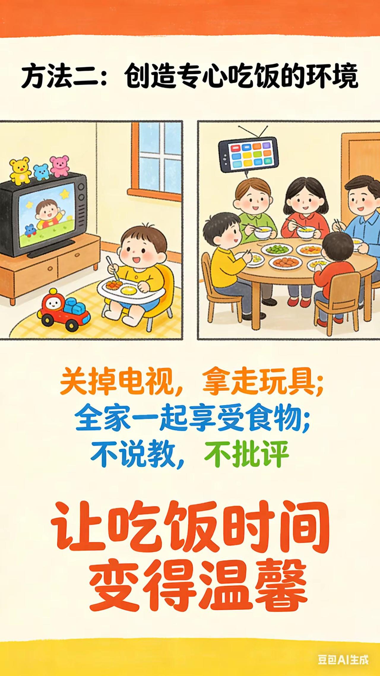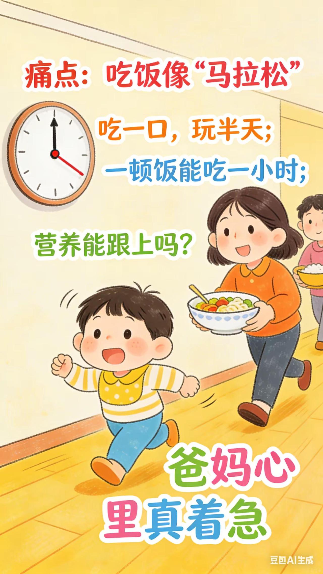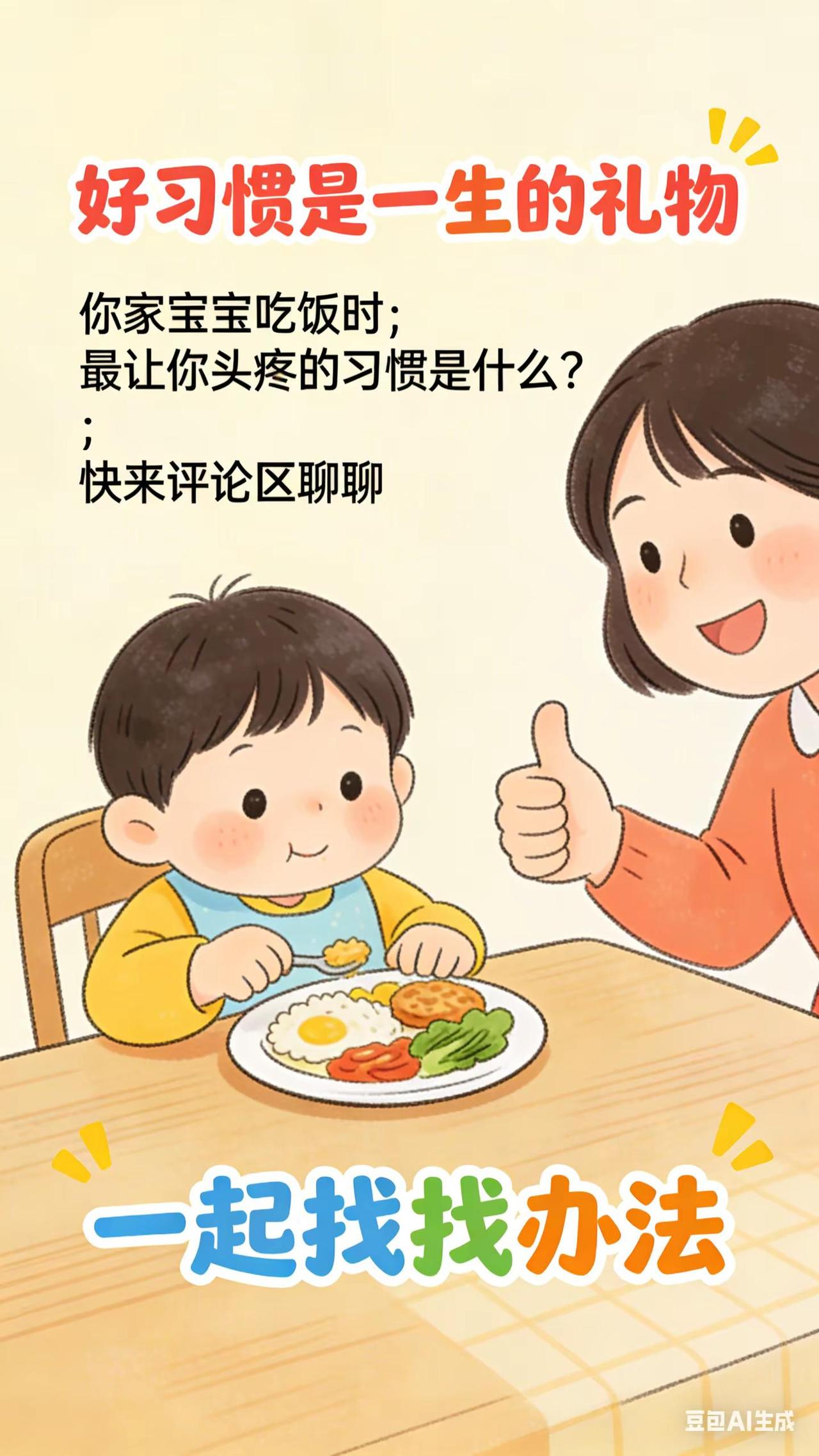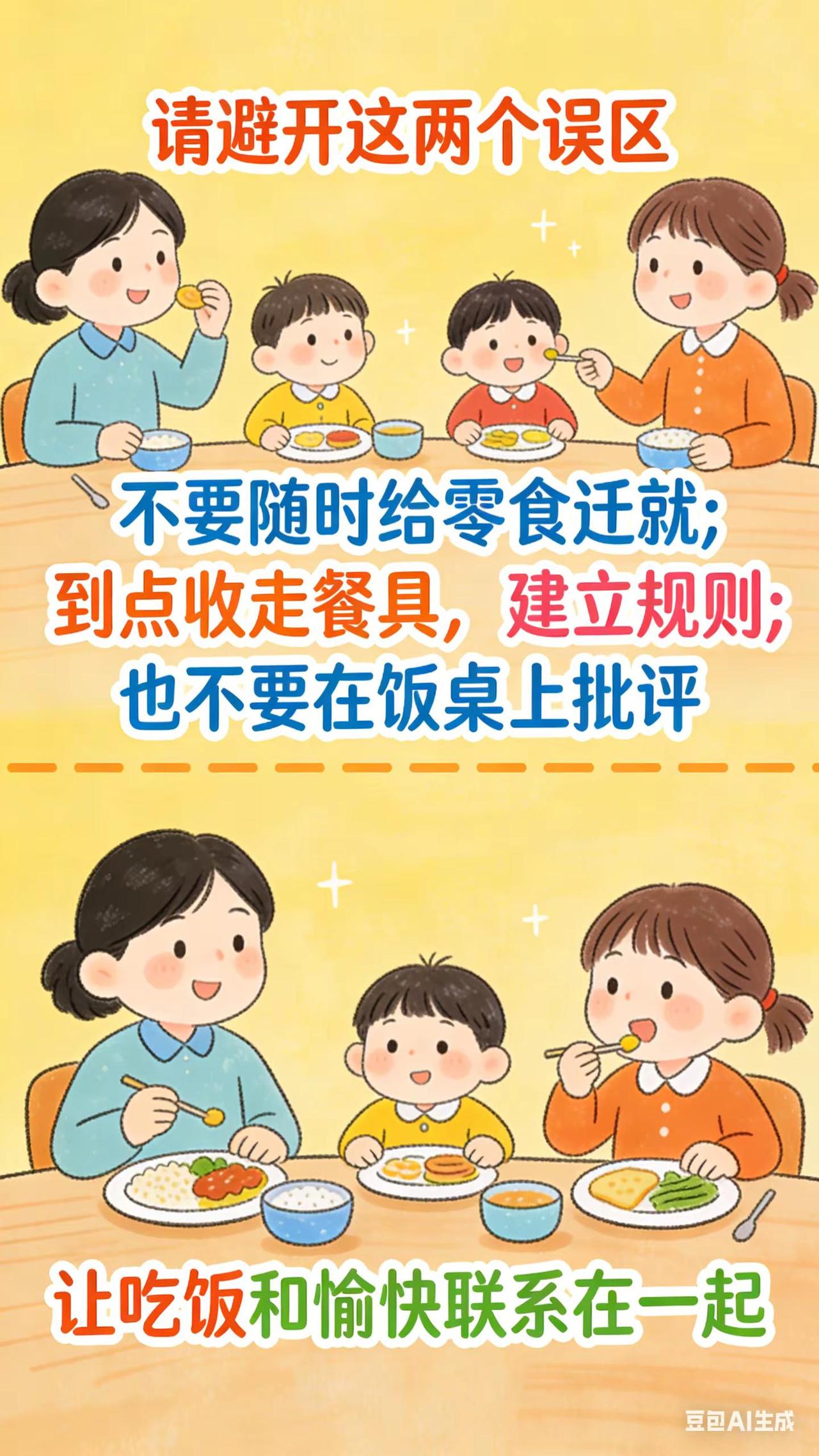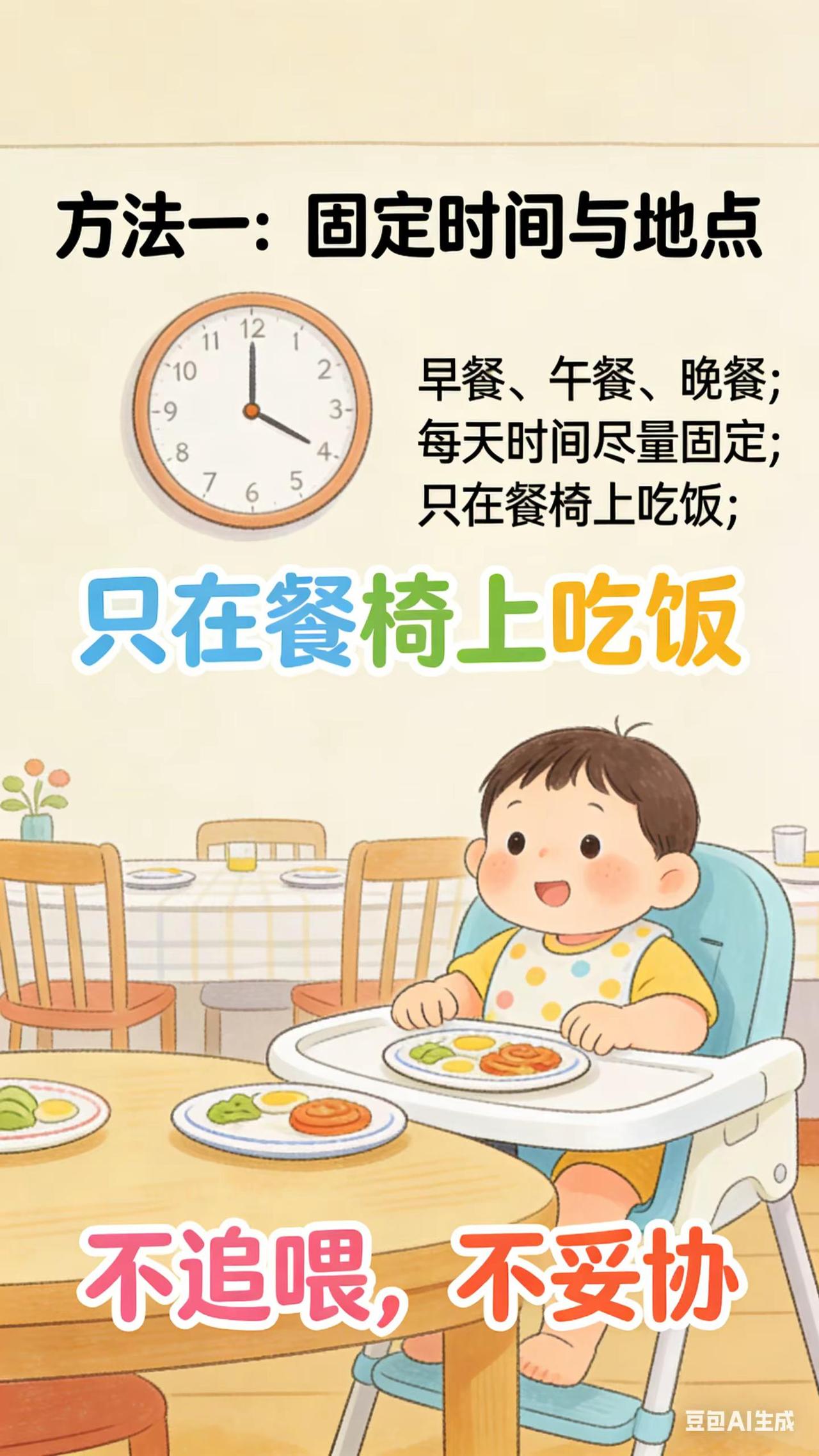 0-3岁喂养与饮食:8.养成吃饭的好规矩。宝宝 2 - 2.5 岁,吃饭时间不规律,边吃边玩,一顿饭能吃很长时间,家长想培养宝宝规律进餐习惯,却不知从何做起,担心宝宝这样下去营养跟不上。科学原理规律进餐有助于宝宝消化系统形成生物钟,更好地消化吸收食物。边吃边玩会分散宝宝注意力,影响进食量和消化,长期可能导致营养不良。培养良好饮食习惯,对宝宝身体健康和生活规律至关重要。具体方法固定进餐时间和地点:每天固定早餐、午餐、晚餐时间,尽量保持一致。让宝宝在专门的餐椅上吃饭,避免在客厅边看电视边吃或追着喂饭。每次进餐时间控制在 20 - 30 分钟,时间到了,不管宝宝是否吃完,都收拾餐具,让宝宝明白吃饭时间有限。减少进餐干扰:进餐时关闭电视、手机等电子设备,拿走玩具。家长也不要在进餐时批评宝宝,营造安静、愉快的进餐氛围。常见误区误区一:迁就宝宝不规律进餐。宝宝偶尔不按时吃饭,家长就随时准备食物,这会强化宝宝不规律进餐行为,应坚持固定进餐时间,帮助宝宝养成规律进餐习惯。误区二:在进餐时教训宝宝。进餐时批评宝宝,会让宝宝产生负面情绪,影响食欲和消化,保持轻松进餐氛围,有利于宝宝养成良好饮食习惯。你家宝宝吃饭时最让你头疼的习惯是什么?快来评论区说说。新手妈妈 育儿经验分享 新手爸妈必看 宝宝吃饭