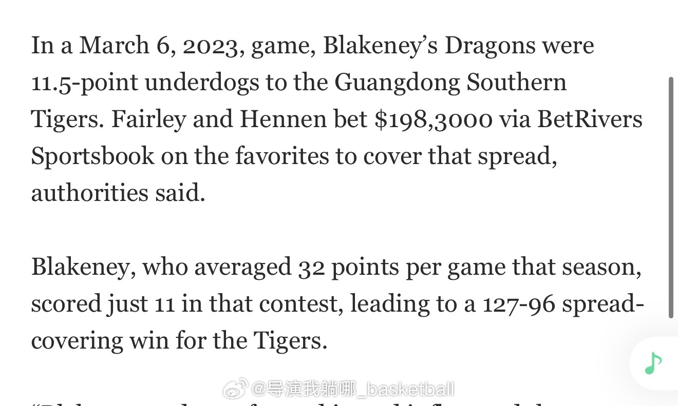 NBC news报道:经过FBI调查有25人被指控操纵NCAA及CBA比赛,明确点出了当时在江苏男篮效力的外援布莱克尼和他的同伙一起下注了2023年3月6日江苏男篮对阵广东宏远的比赛,那场比赛布莱克尼发挥不佳只拿到11分