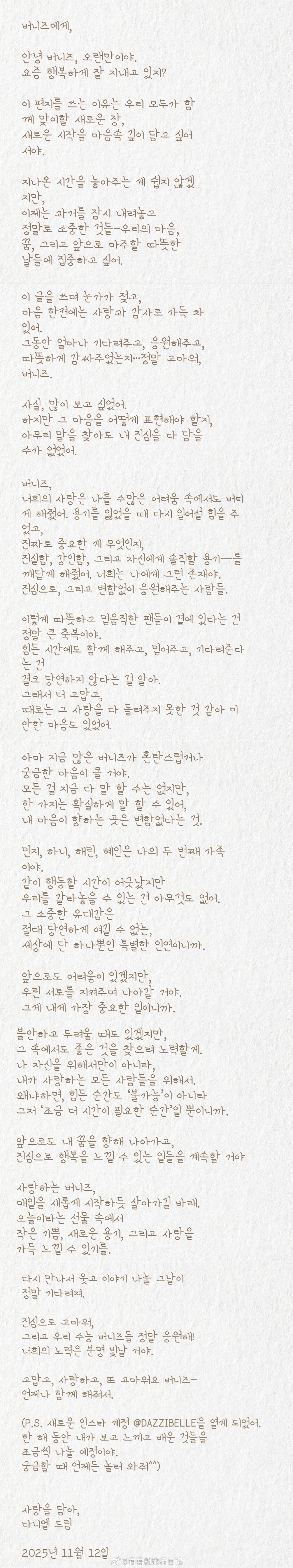 NEW JEANS成员Danielle发长文,告别组合
