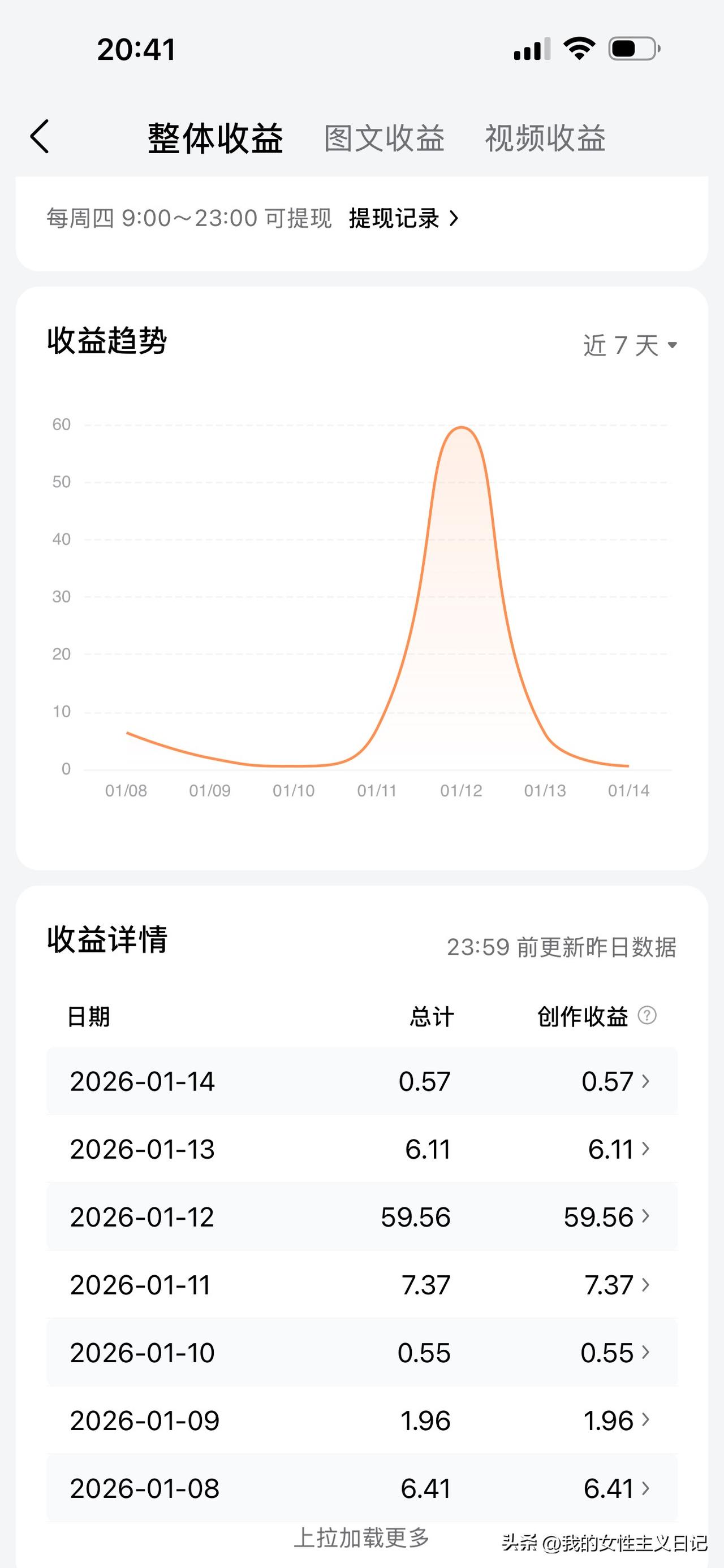 我本来不想晒收益的,收益少,没什么意义,收益多,很多网友达不到,比较之后会产生焦虑。这次晒一下,主要是对微头条的收益感到惊奇。因为一般微头条即使阅读量大,比起文章来,收益少多了,所以很少写。这次写了关于乒乓球的,只是说2026年一月多哈冠军赛后,国乒统治地位不在,不足300字,配了陈振江的照片,平淡无奇,阅读竟然达6万多,收益近60元。近期有篇文章阅读7千多,评论700多,收益还不足20元。微头条不用花很多精力,就是一个想法,看来性价比高很多,只是能有一个想法踩中大众的神经,也是太难了。