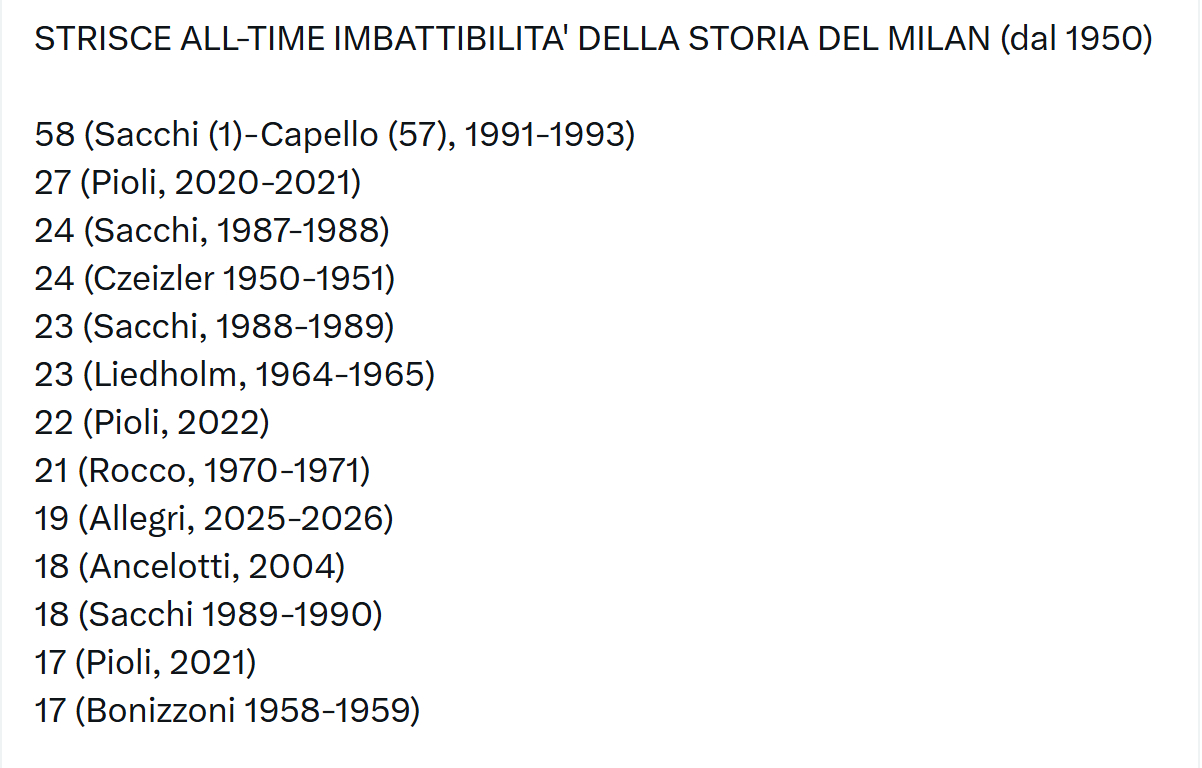 图一,米兰近几年截止到20轮的拿分情况;图二,自1950年起,米兰在联赛里的不败纪录排名,囧实时超越了2004年的安切洛蒂AC米兰