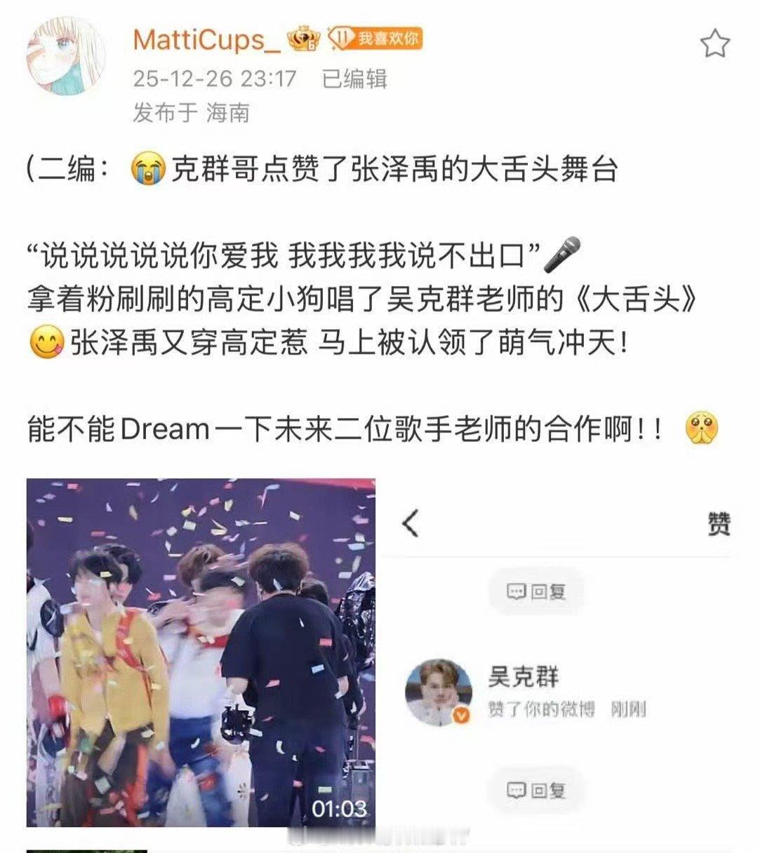 张泽禹唱的大舌头被原唱认证吴克群赞了张泽禹 张泽禹唱的大舌头被原唱认证,已经不止