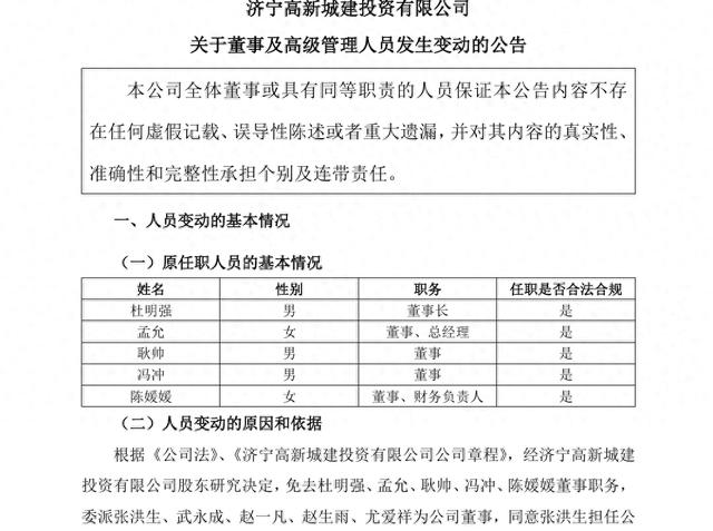 1月14日,济宁高新城建投资有限公司(下称“济宁高新城投”)公告称,解聘孟允总经理职务,聘任武永成为公司总经理,聘任魏艳文为公司财务负责人,选举张洪生为公司董事长。