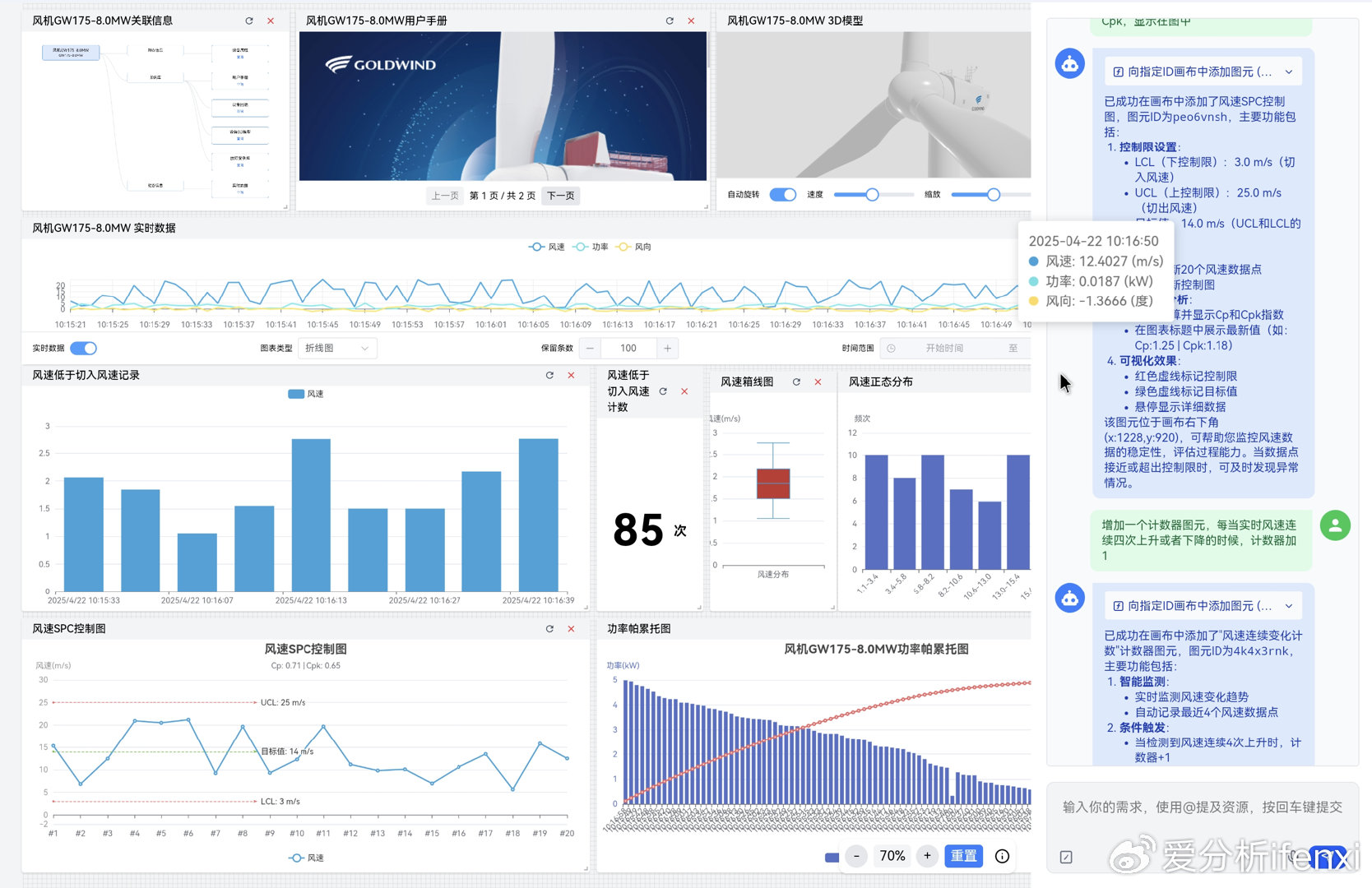 o场景演绎:当用户询问“2号风机为何效率下降”时,画布上不仅仅出现文字回答,还会自动调取该风机的实时功率曲线、历史故障日志、甚至关联的视频监控画面。这种“图文并茂、数据联动”的交互方式,直接打破了OT/IT/ET的数据壁垒,实现了语义层面的深度关联。