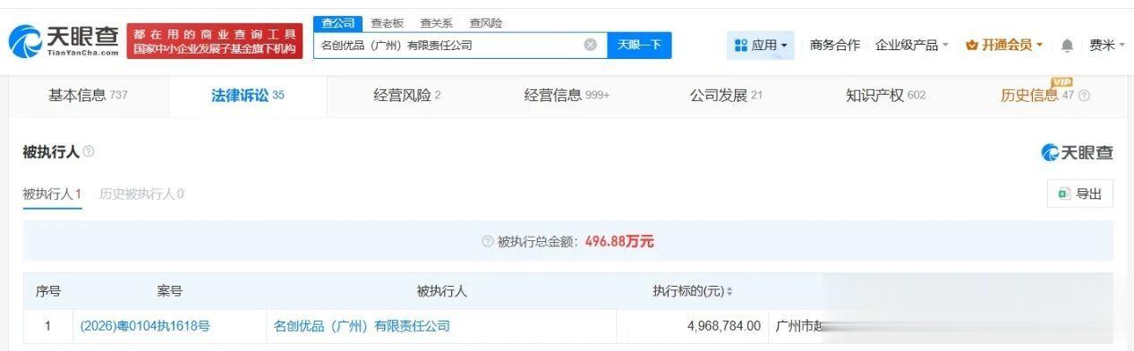 天眼查天眼风险信息显示,近日,名创优品关联公司名创优品(广州)有限责任公司新增一则被执行人信息,执行标的496万余元,执行法院为广州市越秀区人民法院。