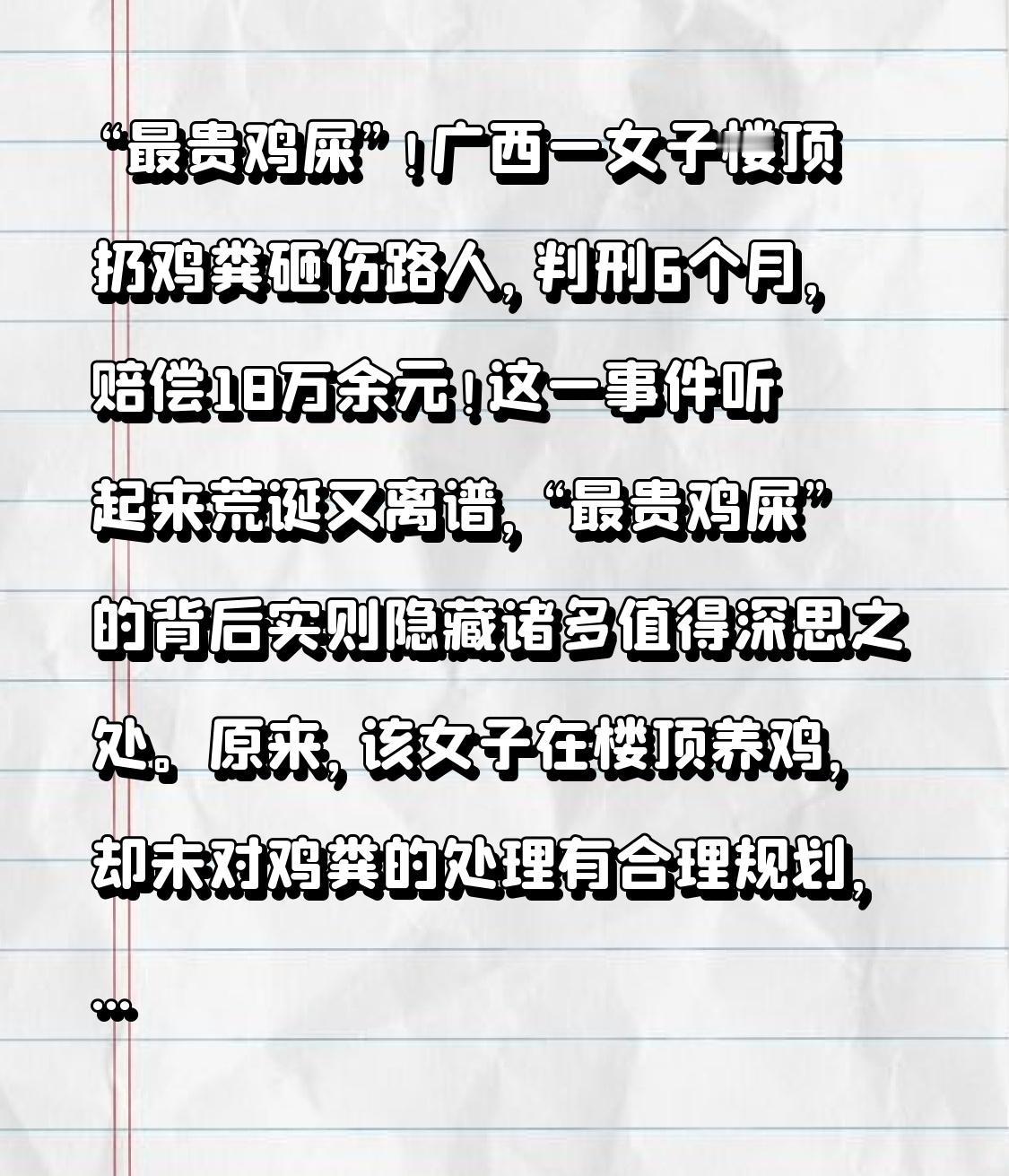 “最贵鸡屎”!广西一女子楼顶扔鸡粪砸伤路人,判刑6个月,赔偿18万余元!这一事件听起来荒诞又离谱,“最贵鸡屎”的背后实则隐藏诸多值得深思之处。 原来,该女子在楼顶养鸡,却未对鸡粪的处理有合理规划,随意将鸡粪从楼顶扔下。这一危险行为看似平常,实则充满安全隐患。被砸伤的路人完全是在毫无防备的情况下遭遇飞来横祸,身体和精神都遭受了极大的创伤。 判刑6个月,这是法律对该女子危害公共安全行为的严厉惩戒。在建筑物抛掷物品,不仅可能对他人生命安全造成直接威胁,也破坏了公共安全秩序。而赔偿18万余元,是对伤者身体损伤、医疗费用以及精神损失等多方面的补偿。 此事件也给大家敲响了警钟。在日常生活中,每个人都应提高自身的安全意识和法律意识,杜绝从建筑物抛掷物品这种危险且违法的行为。不论是高楼住户扔垃圾,还是像该女子这样扔鸡粪,都不可抱有侥幸心理。毕竟,一个小小的举动,就可能酿成无法挽回的悲剧,让自己陷入法律纠纷和道德谴责之中。大家务必要时刻谨记,维护公共安全,就是在保护自己和他人的生命与财产安全。