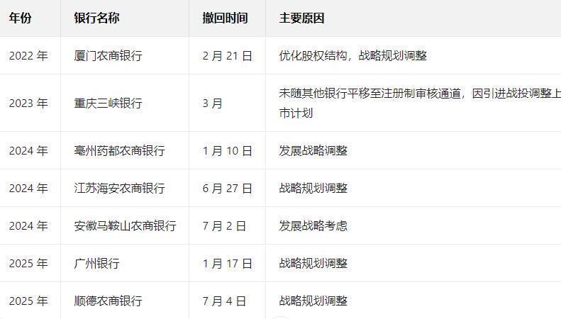 据深水财经社统计,自2022年以来,已有7家中小银行撤回上市申请,分别是厦门农商行、重庆三峡银行、亳州药都农商银行、江苏海安农商银行、安徽马鞍山农商银行及广州银行、顺德农商银行。