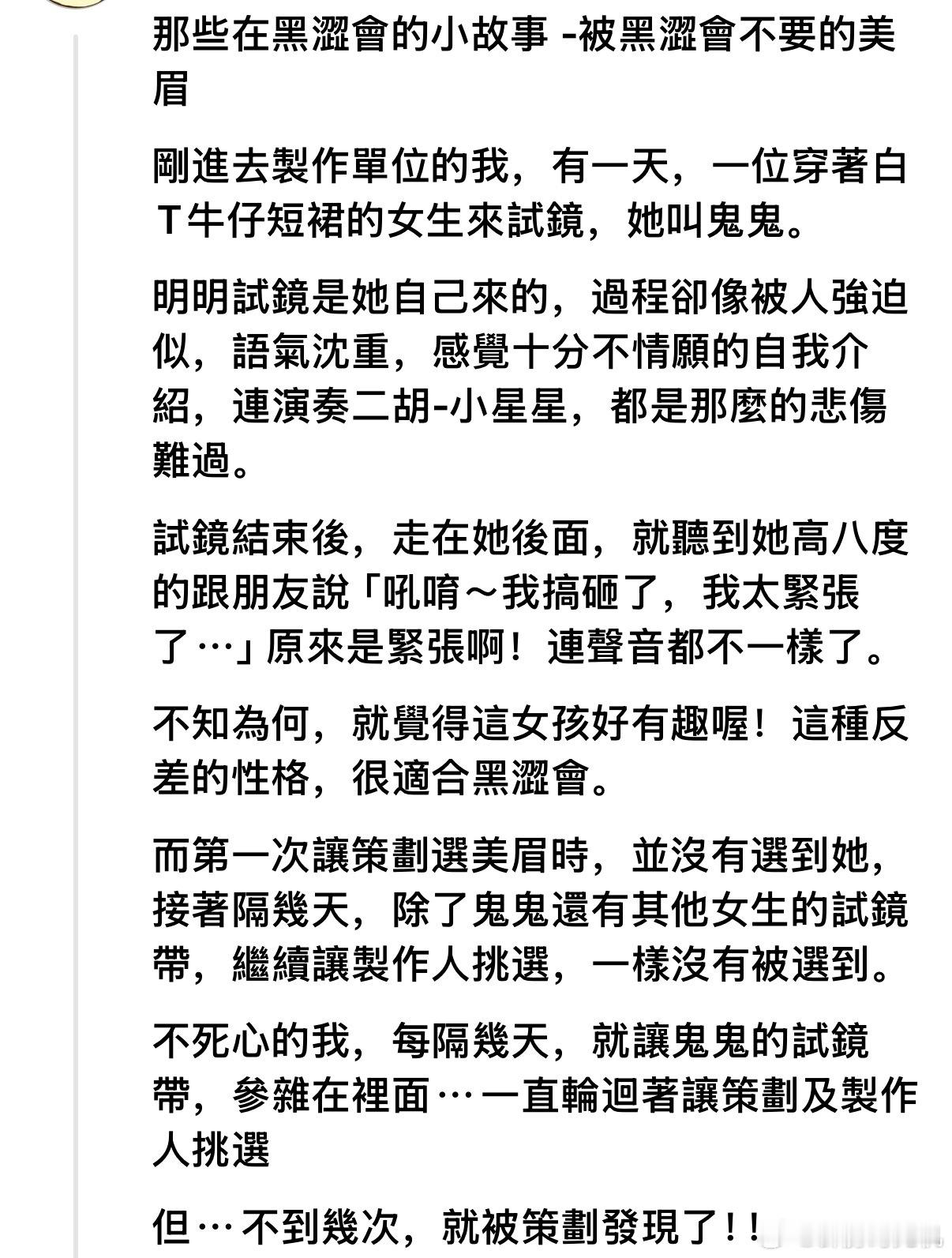 前美眉节目的工作人员写了“被不要的美眉”,提到鬼鬼当时试镜紧张,所以没被策划选中