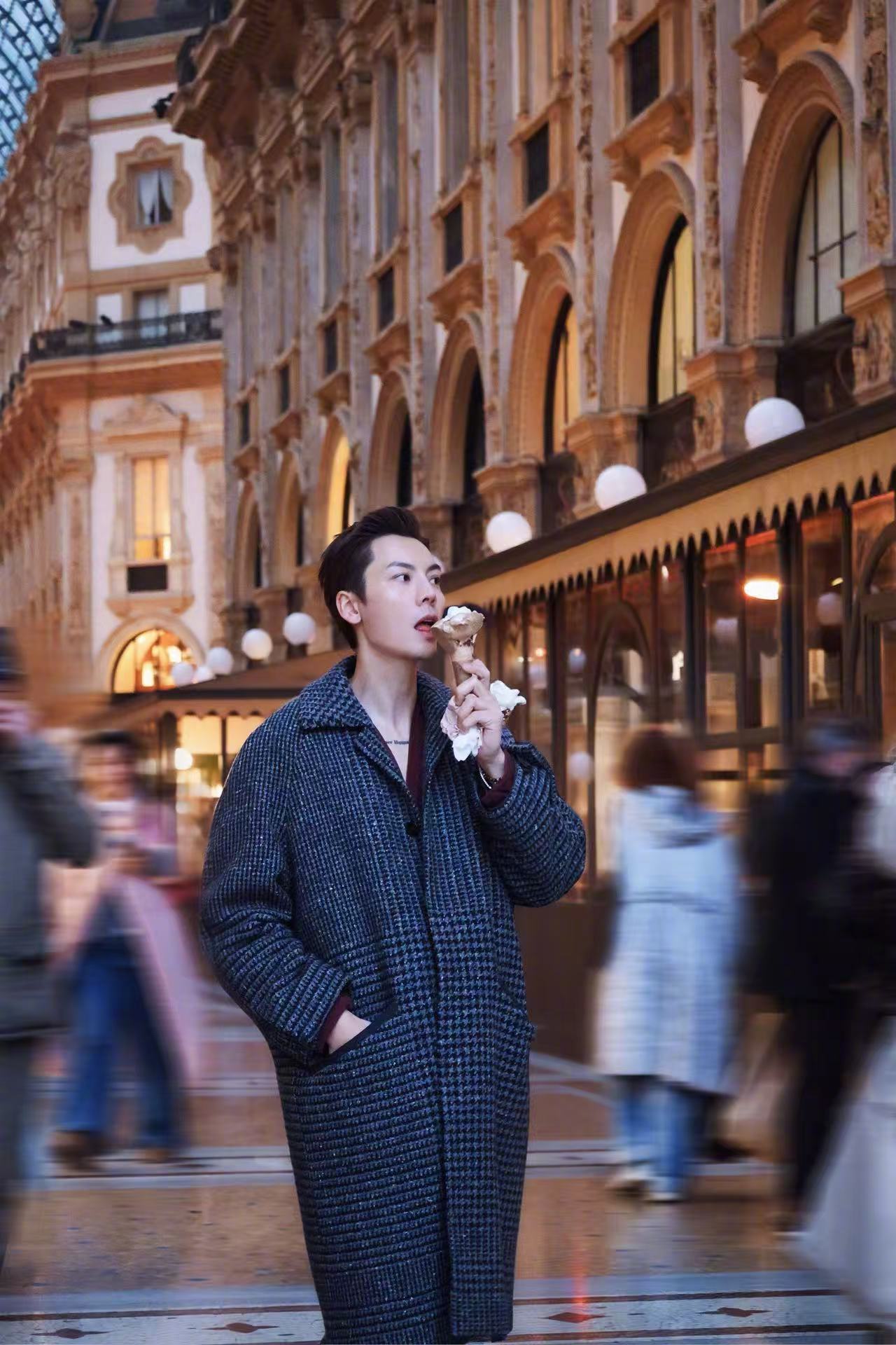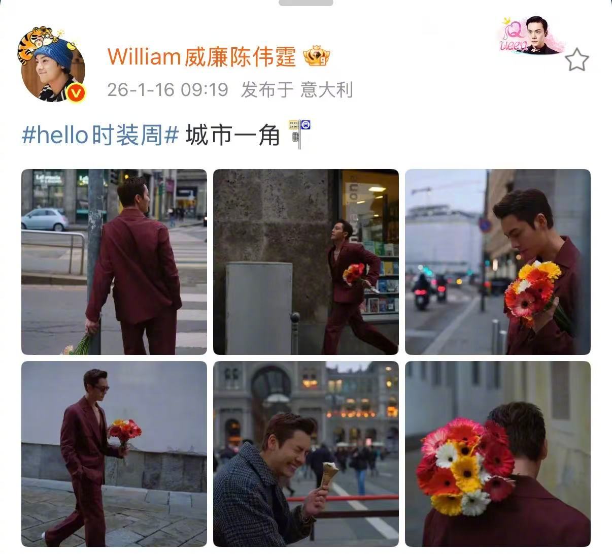陈伟霆大冷天愿意为我这样 7度的寒风抵挡不住酒红深v的帅!谁懂哥捧花跑过来的这一幕!对我的眼睛很友好啊啊!米兰时装周 hello时装周