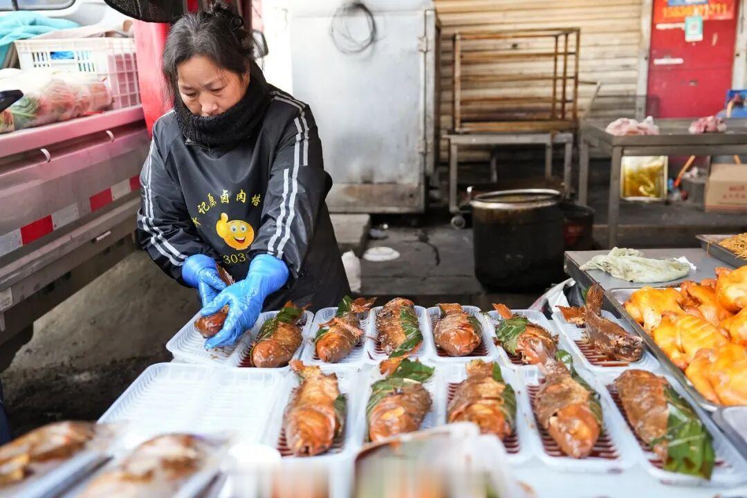 酥鱼摊前围满了人,鲫鱼炸得酥透,在秘制汤汁里浸泡入味,连骨头都酥软可食。这道传统菜,年轻人可能不会做,但尝过一次就忘不了。这是许多人家过年必备的凉菜,买上几条,年味就更近了些。