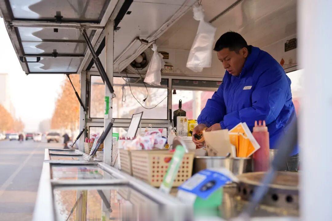 “多放辣,少要葱!”上班族边扫码边嘱咐,接过热乎乎的煎饼,匆匆挤进人群。