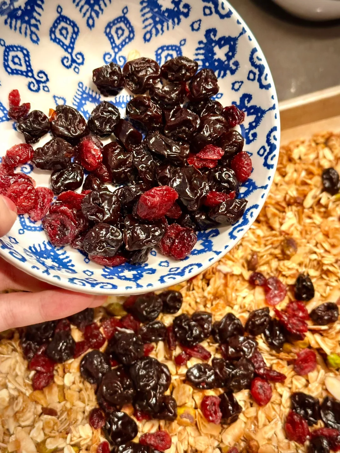 烤好后加入樱桃和蔓越莓拌匀就完成了!记得不要把果干放进去一起烤,口感会不那么湿润饱满,而且有可能干巴甚至变焦;