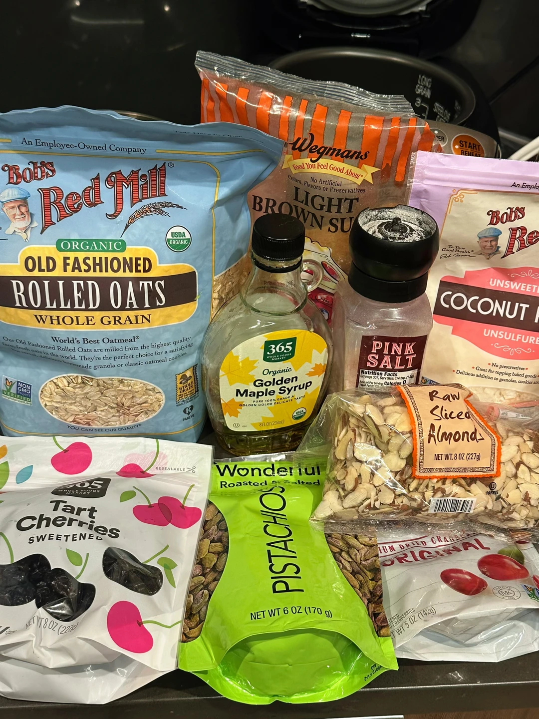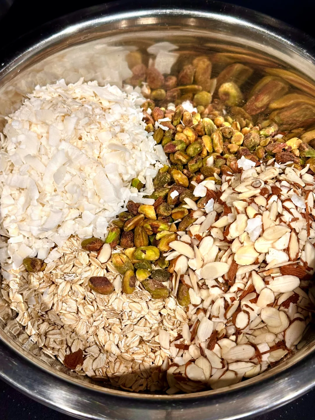 燕麦rolled oats2又3/4cup,开心果1cup,无糖椰子片1cup,南瓜籽1/3cup(我用了杏仁片),海盐1tsp,黄糖1/3cup,枫糖浆1/3cup,橄榄油1/3cup,酸樱桃干3/4cup(我还加了点蔓越莓)