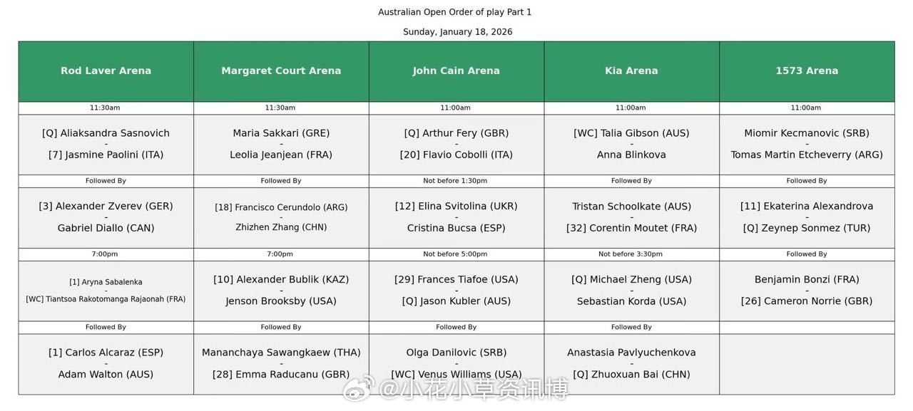 小花小草资讯 【2026澳网】首日赛程(张之臻、白卓璇出战)