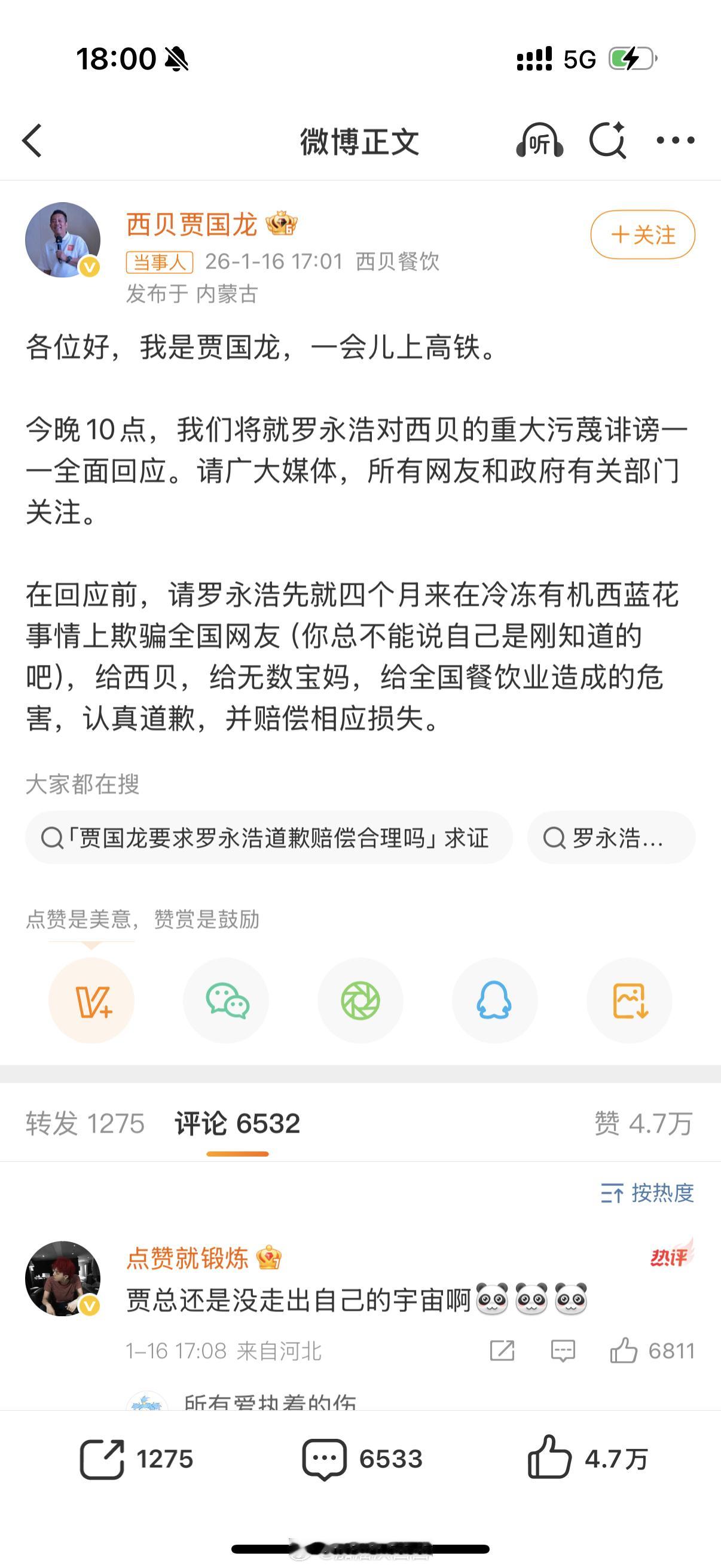 贾国龙今晚10点全面回应贾总身边就没一个敢说真话的吗?最好的公关是闭嘴,这场闹剧多久才能结束啊,天啊搞笑的是贾国龙是龙哥,罗永浩也是龙哥,二龙PK呢这是