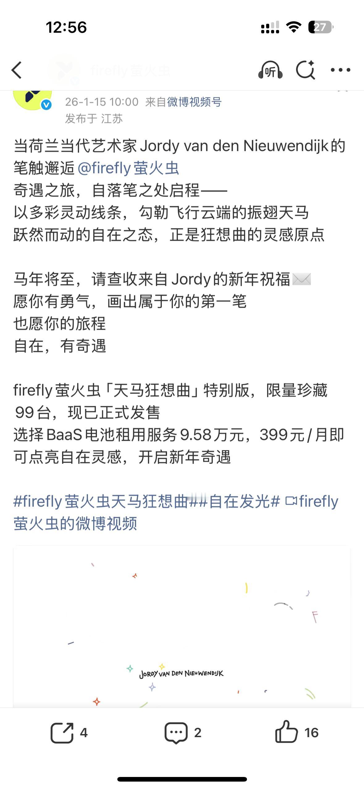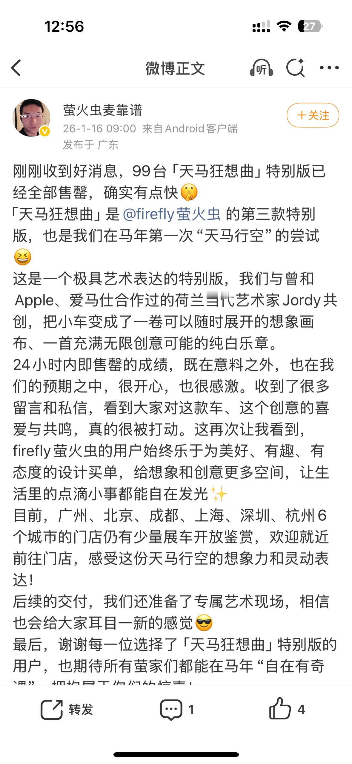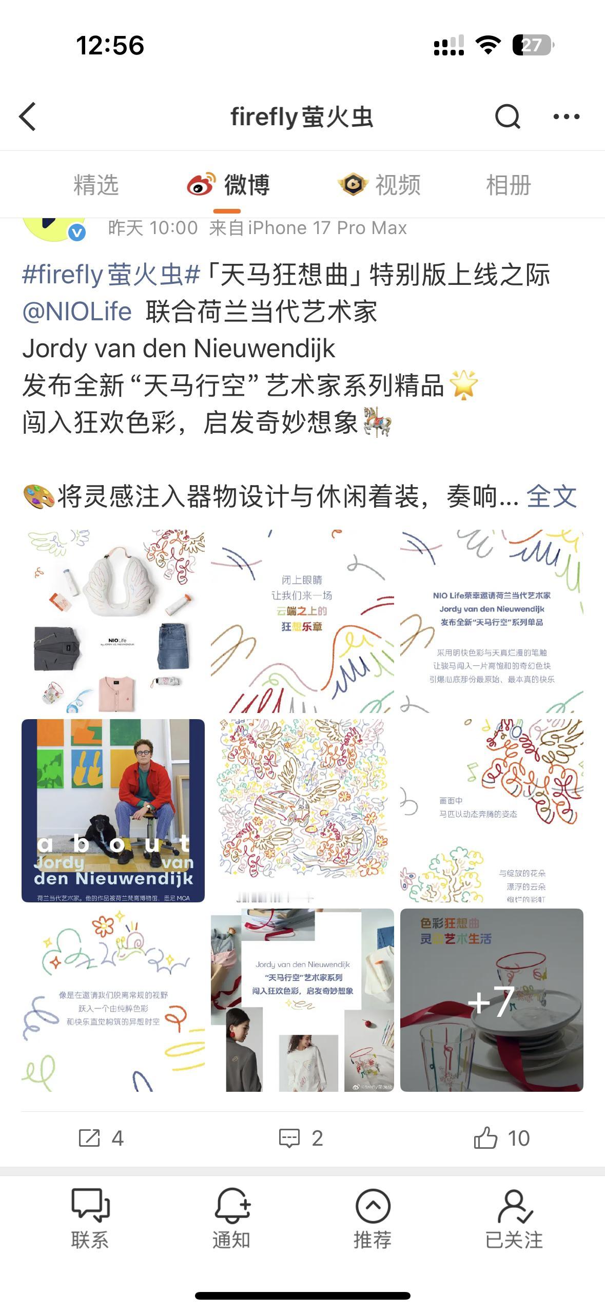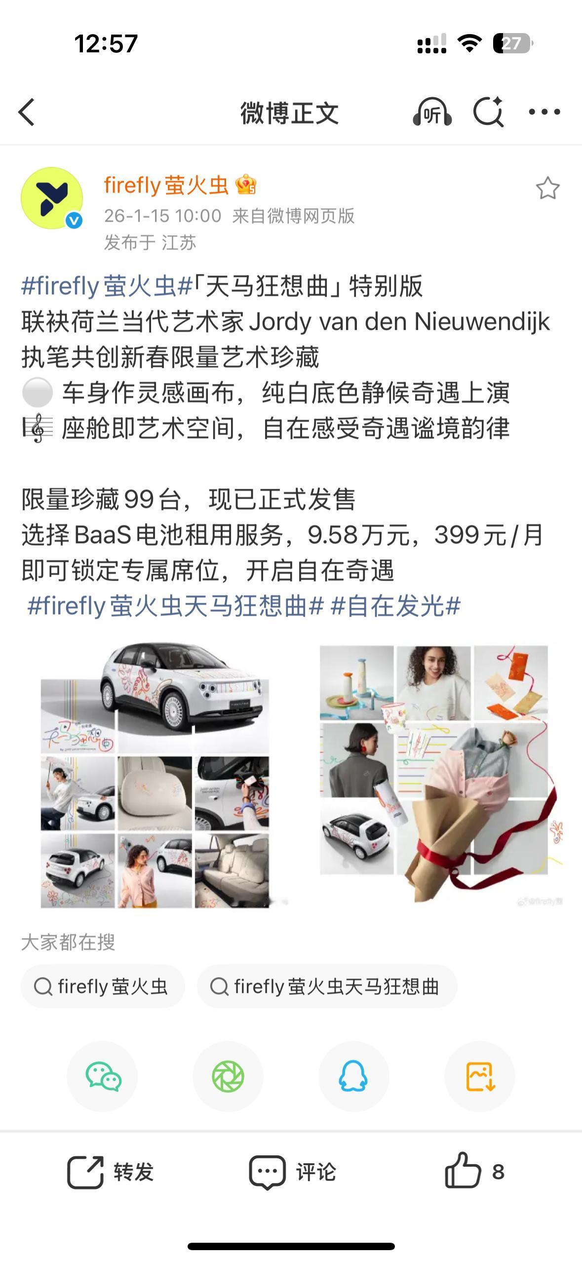 前两天刚听完罗永浩和名创优品老板的访谈,内容里面有一块就是聊中国IP的,简单说,名创要转型成为中国最好的IP类公司,不仅有全球联名,还要把中国原创是IP做好。 再来,看到萤火虫这次的~天马狂想曲~特别版,99台已经售罄,荷兰当代艺术家Jordy van den Nieuwendijk的画作。 这是一次很有意思的合作,但我思考,蔚来品牌作为在国内经常会出联名产品的车企,可以多多关联国内的新锐画作、创作者,让市场也看到他们,虽然说艺术家都是古怪的,但作品可以背知道,是不是也是一家好事,而且蔚来之名,感觉事情马到成功的概率会不会高一些。【来自懂车帝车友圈】