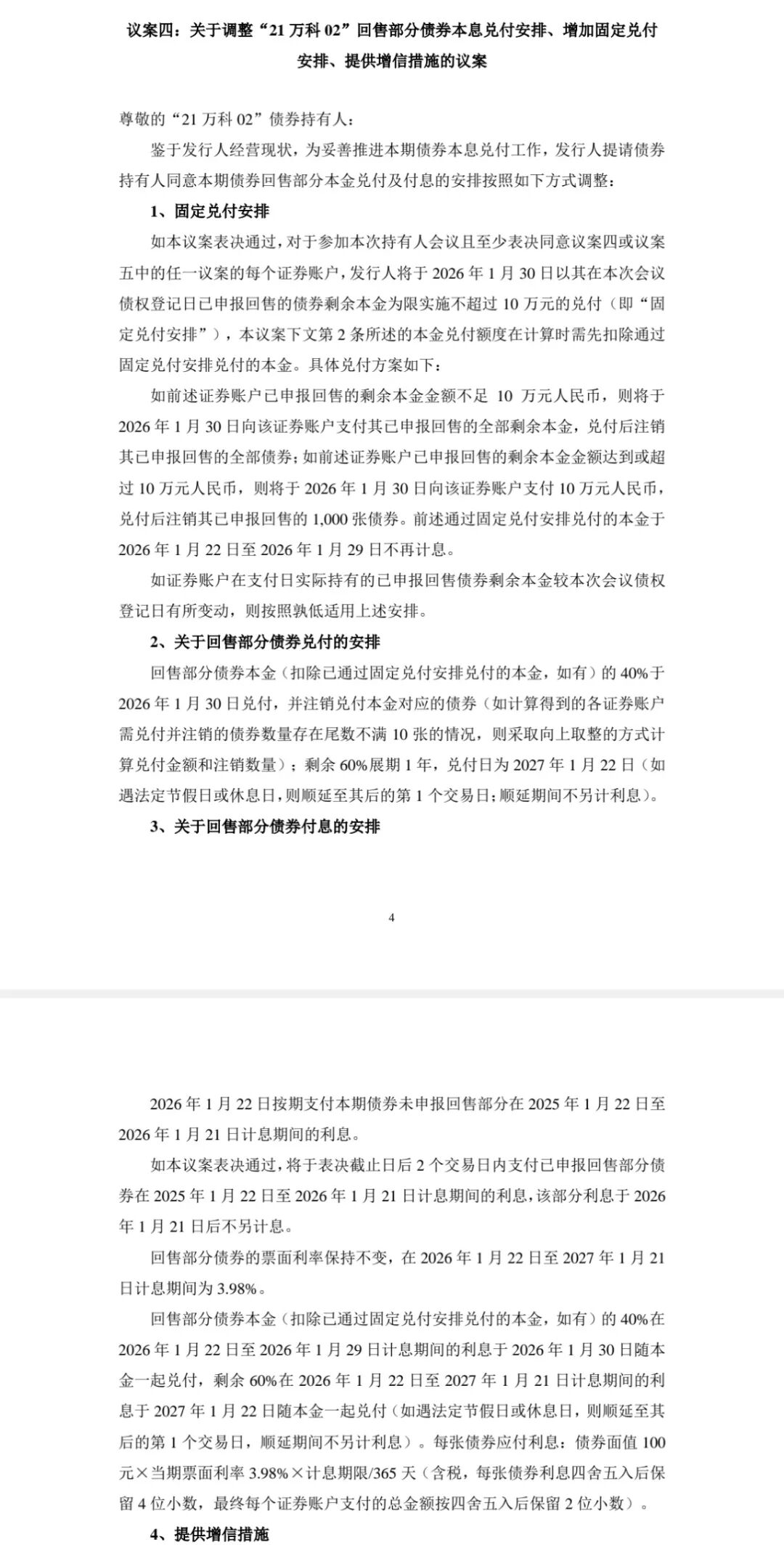 议案四的核心内容是“部分兑付+剩余展期”。一方面,万科要向支持议案四或五的参会账户,于1月30日兑付不超过10万元本金(即固定兑付);另一方面,在扣除已通过固定兑付安排兑付的本金的基础上,1月30日对回售部分债券本金的40%进行兑付,剩余60%展期一年。