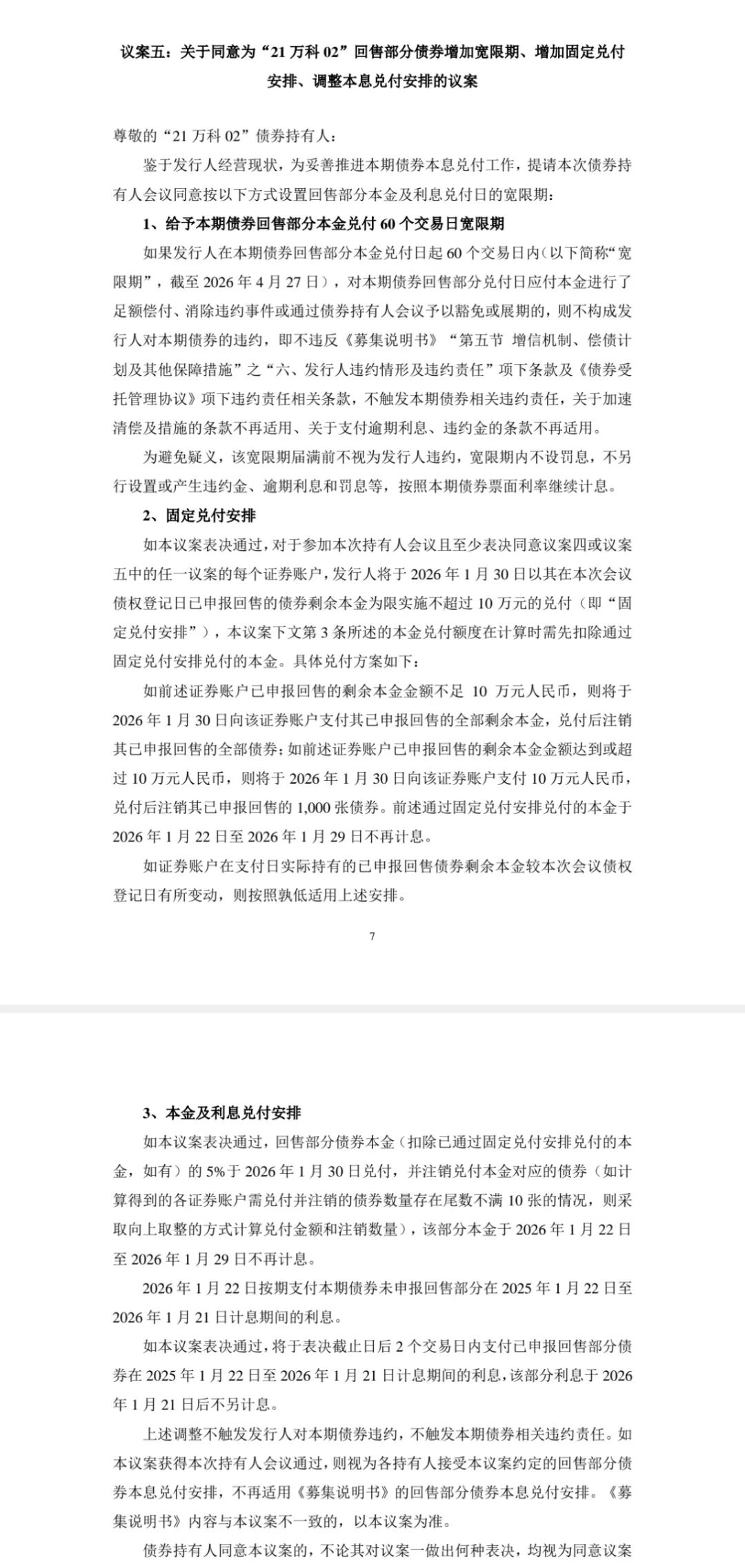 议案五则是“小额兑付+长宽限期”。即给予本期债券回售部分本金兑付60个交易日宽限期,并在固定兑付(同方案四)的基础上,1月30日将剩余回售本金的5%进行兑付。