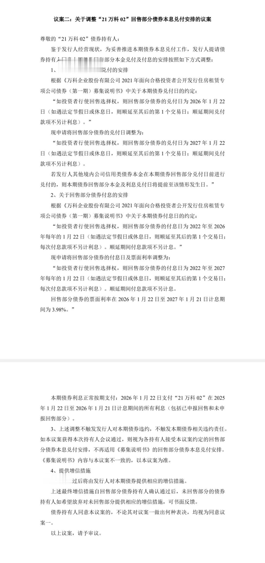 2025年12月31日,针对“21万科02”,万科提出了三项议案。其中,议案二要求将回购部分债券全额展期一年,万科将在2026年1月22日支付前一年的债券利息,本金和展期一年的利息同步在2027年1月22日兑付,展期期间的利率维持原票面的3.98%不变。与此同时,万科表示还将增加相应的增信措施。