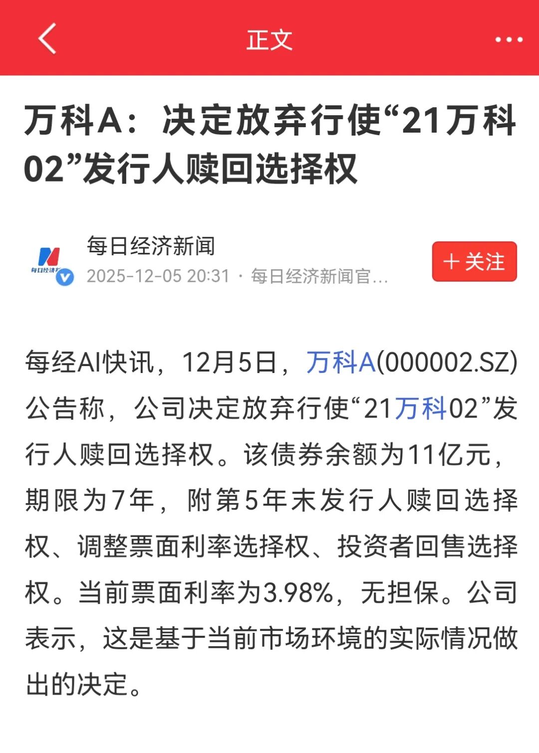 由于目前面临着重重压力,2025年12月5日,万科发布公告称,决定不在行权日赎回全部债券,债券将继续存续至2028年。
