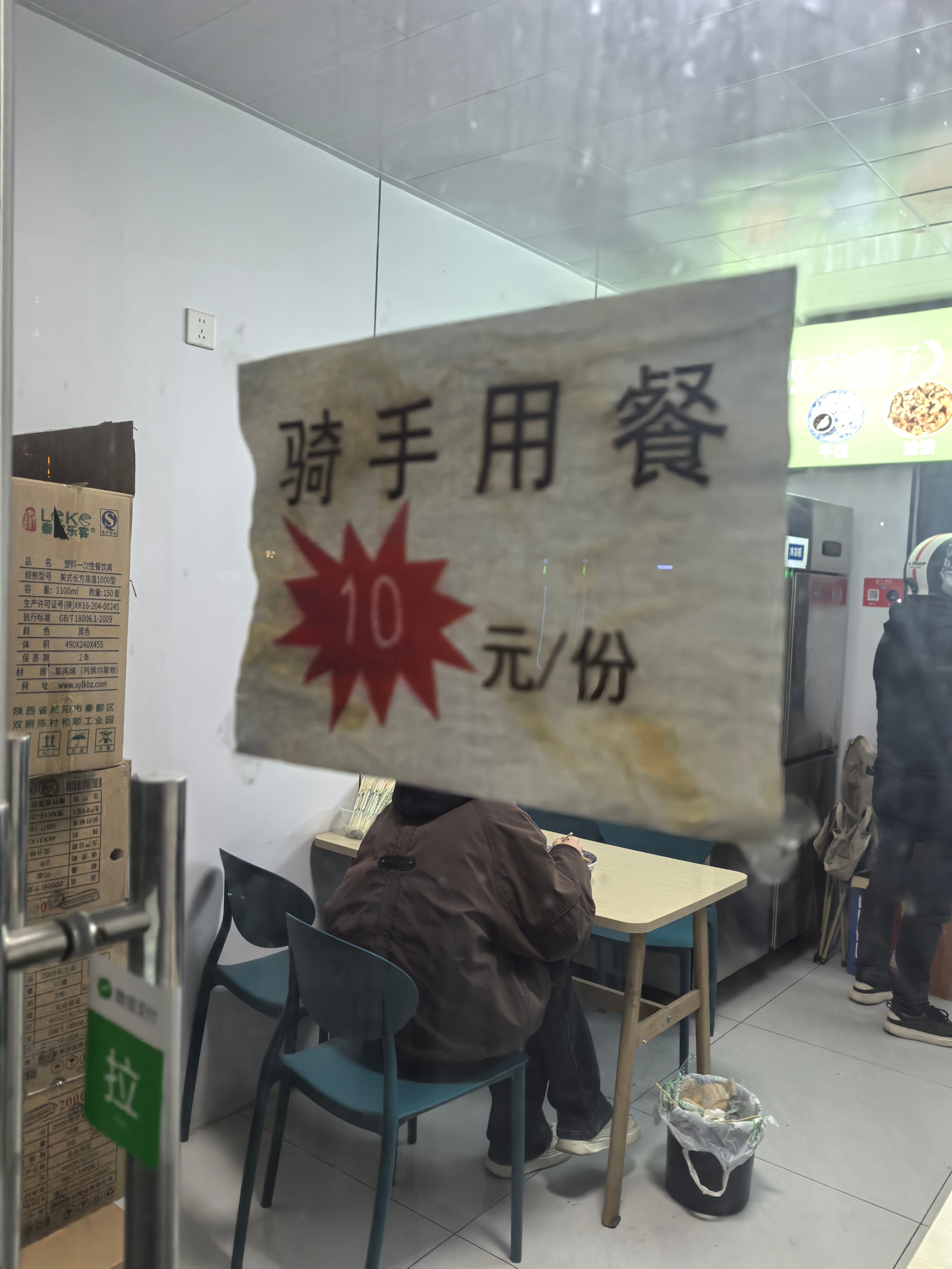 路过一家水饺小店,店老板挺暖心的,骑手用餐10元/份,这家门店比较小,一份定价十