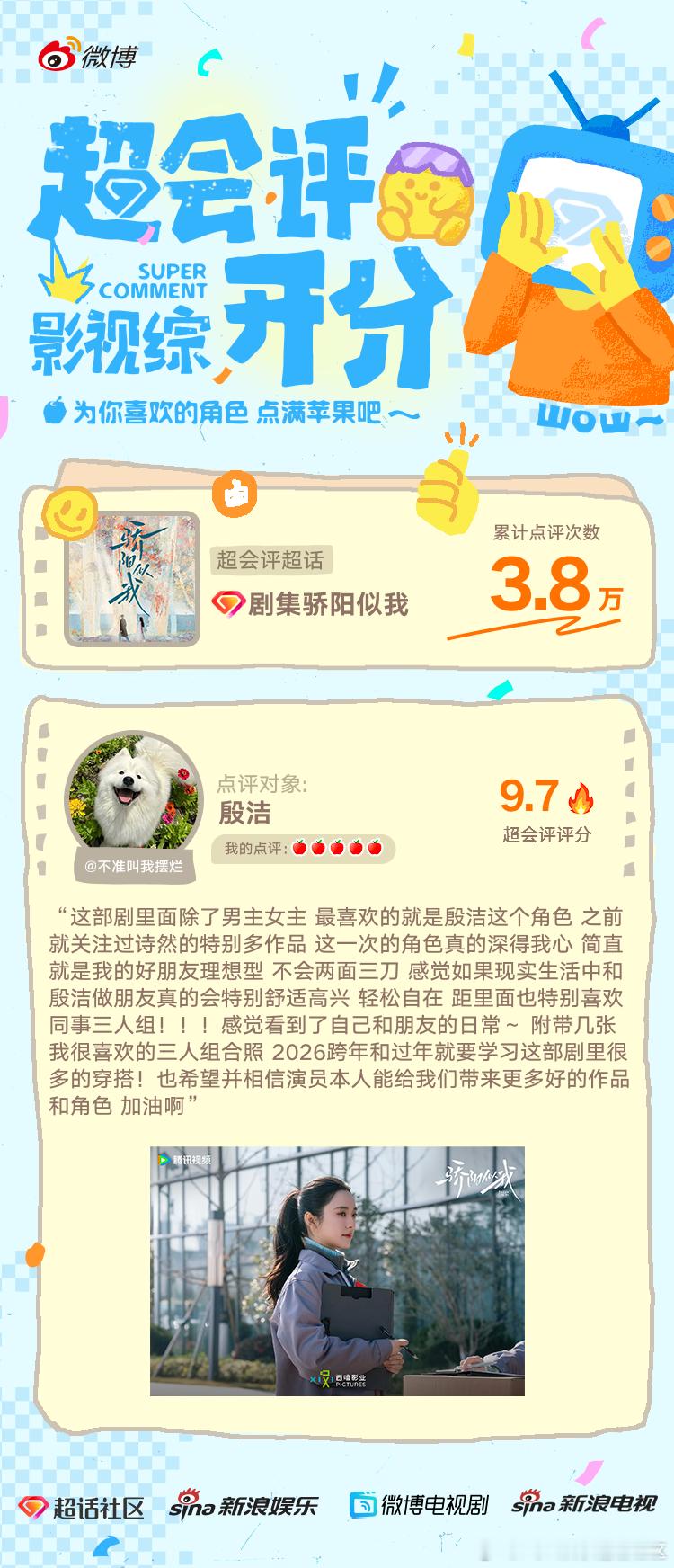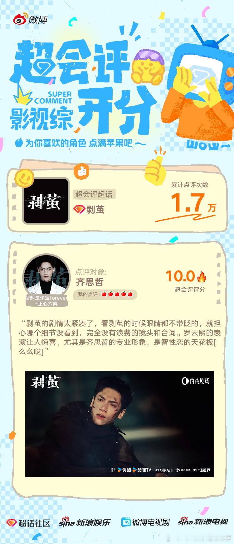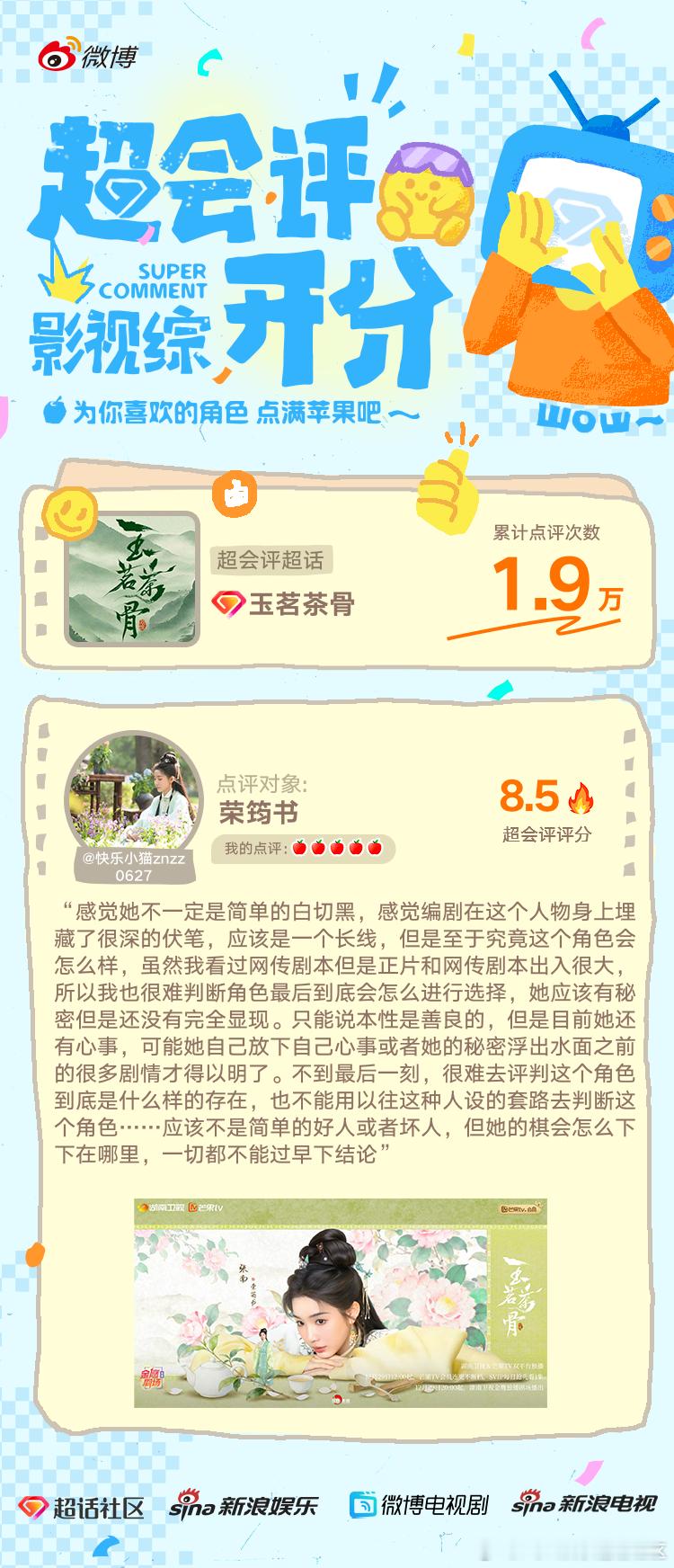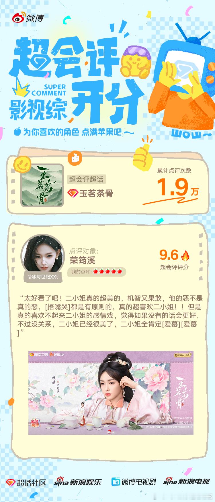 影视综超话超会评开分 恭喜以下uu们为影视综超会评贡献的优质内容,以下被公示的优质点评内容均可获得超话周边礼品一份(此排名不分先后顺序)~剧集骄阳似我 丨玉茗茶骨 丨剥茧 丨 电视剧逍遥 丨 电视剧人之初 丨 更多新剧超会评即将上线,欢迎uu们输出对角色的优质点评,活动发起请关注每月月初公布的活动PR!