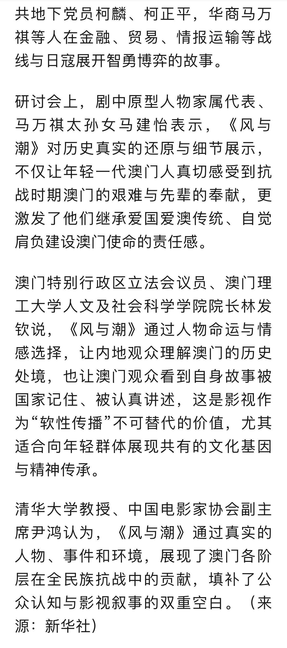 中央政府驻澳门联络办公室发任嘉伦《风与潮》,对历史真实的还原与细节展示,不仅让年轻一代澳门人真切感受到抗战时期澳门的艰难与先辈的奉献,更激发了他们继承爱国爱澳传统、自觉肩负建设澳门使命的责任感!