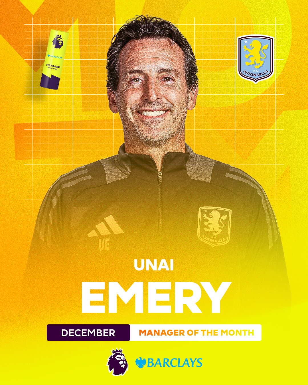 英超官方:阿斯顿维拉主帅埃梅里当选英超12月最佳主教练