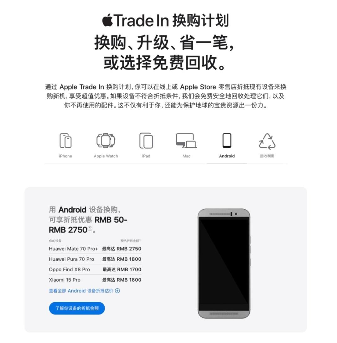 苹果最新调整以旧换新政策,最高抵扣金额达5800元,涵盖iPhone、iPad及Mac等多款产品,此举引发广泛关注。 随着科技产品的快速迭代,旧设备的处理成为消费者的一大难题。近日,苹果公司宣布更新其以旧换新政策,针对iPhone、iPad以及Mac系列设备,最高可享受5800元的抵扣优惠。这一举措不仅吸引了大量苹果老用户的关注,也拓展了对华为、小米等安卓设备的支持范围,进一步提升了市场的竞争力。具体而言,iPhone 16 Pro Max在中国区最高可抵扣5800元,iPad Pro同样高达5800元,MacBook Pro则可达6050元。此外,华为Mate X5和Mate 70 Pro+分别最高可抵2850元和2750元,OPPO Find X8 Pro、vivo iQOO 13和小米15 Pro也都享受到了不同程度的折扣。这一系列调整旨在提升用户体验,同时也为旧设备使用者提供了更多选择和便利。