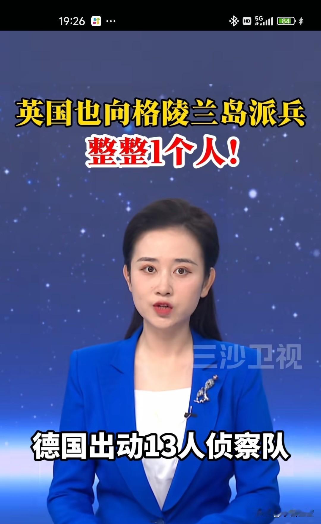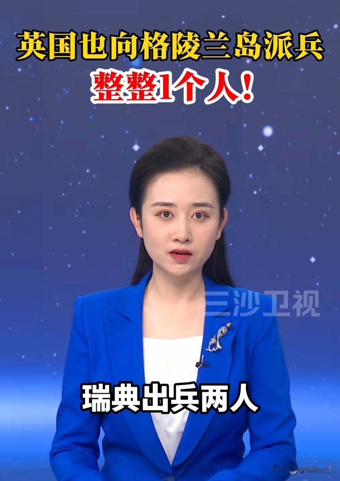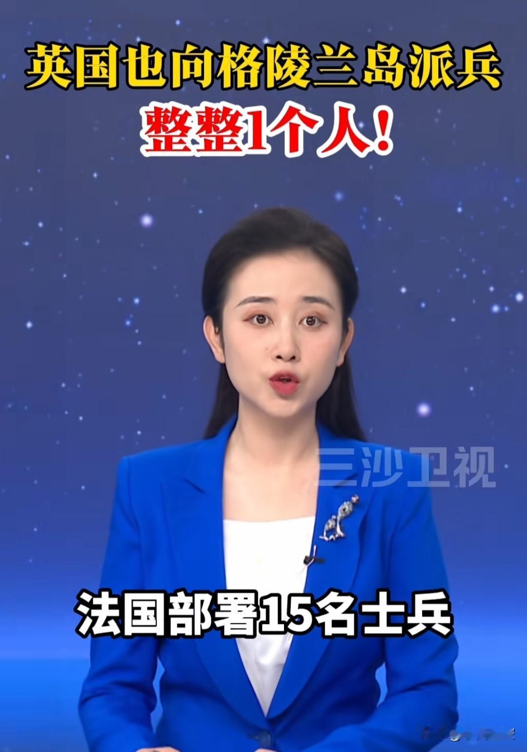 欧洲好团结啊。 来自三沙卫视的报道,欧洲各国向格陵兰岛派兵,英国,整整一个人! 如果可以再少点,是不是准备派半个人过去?或者说,只派一名军官的武器装备过去? 四个国家派出的人,平均达到将近两位数,一个非常恐怖的数字。请原谅我不厚道的笑了。