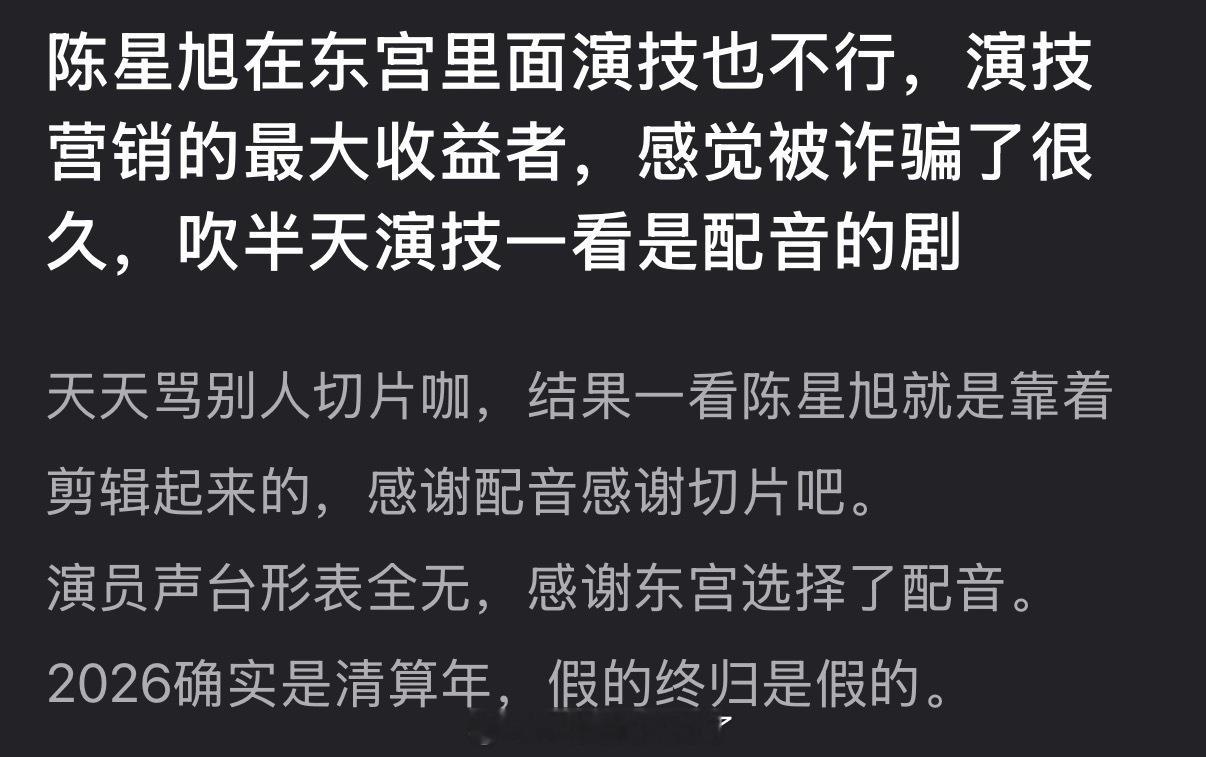 有网友说陈星旭在东宫里面演技也不行,演技营销的最大收益者,感觉被诈骗了很久,吹半天演技一看是配音的剧,大家怎么看?