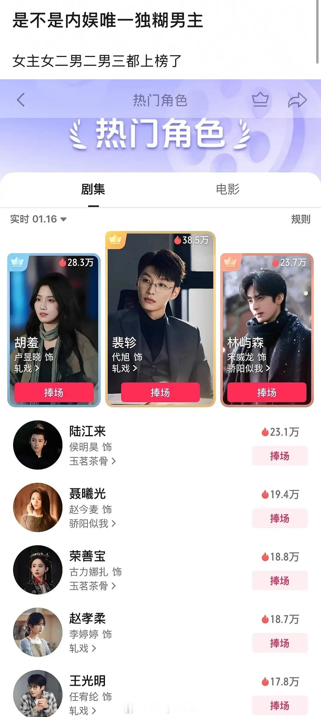内娱唯一独糊男主——陈星旭,女主、女二、男二、男三都上榜了热门角色,什么叫史诗级掀桌