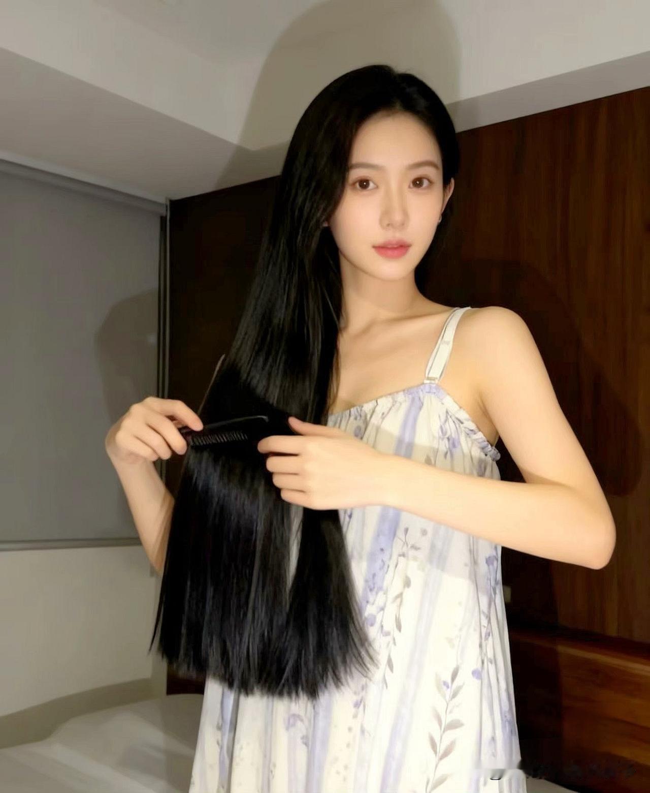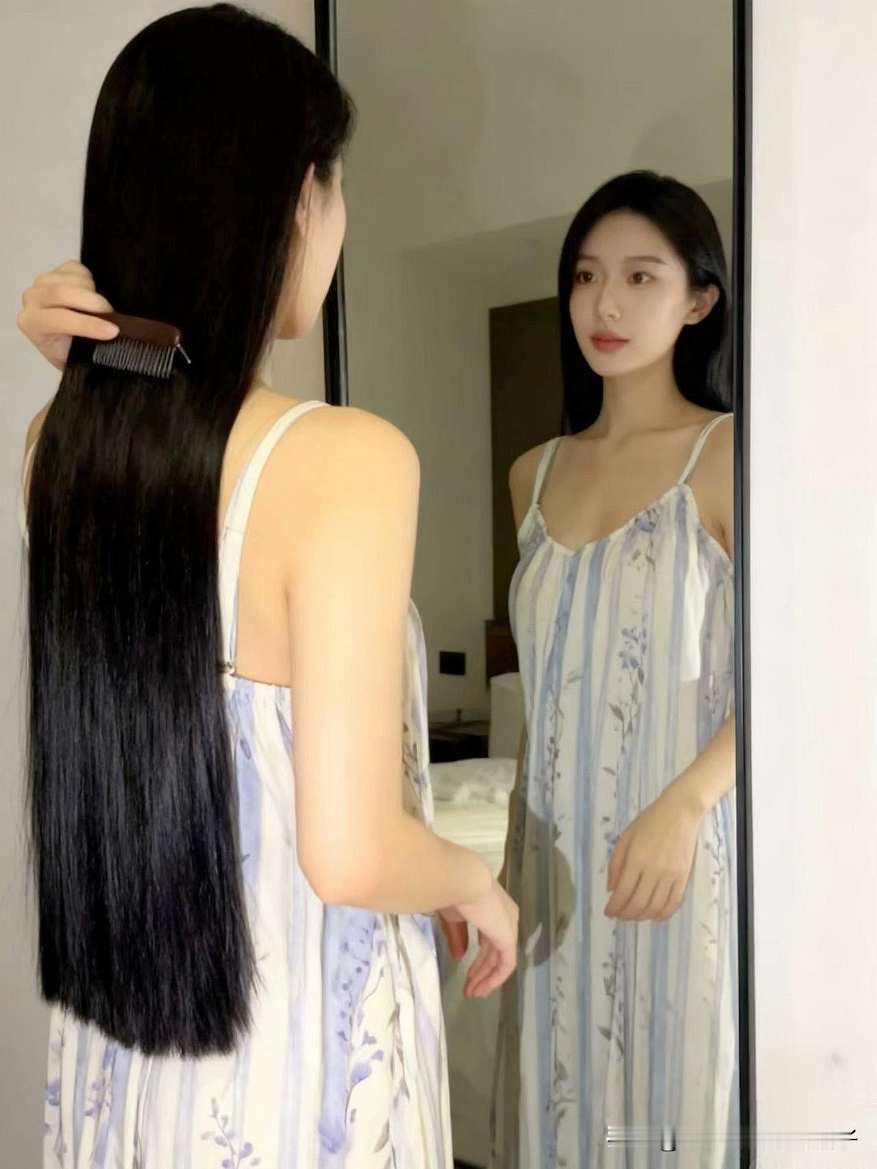 夜晚的柔光下,长发女孩轻轻抚摸着她的秀发,散发着宁静与美丽。