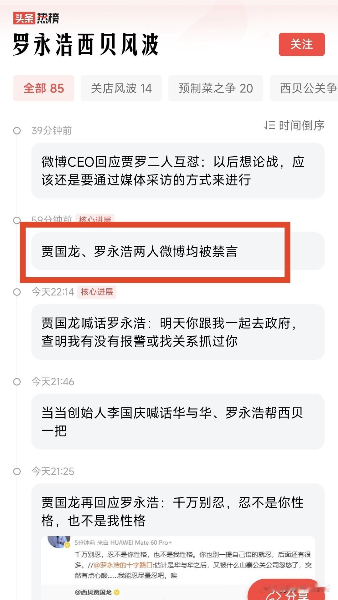 原以为罗贾之间的争论消停了,没想到今天突然失控了,两个人的微博都被禁言了,我觉得问题出在两个人的性格上。一个喜欢直言不讳,不考虑商业、网络生态,一个则是一根筋我行我素。 西贝的话题我很早也看过,其实预制菜本就是一个大趋势,但是肯定会影响最终定价,但是如果及时作出战略调整,有以前的口碑人气在那里,这也不是致命问题。西贝作为餐饮行业的一个龙头品牌,存在问题有没有必要这么针锋相对的指出,也是一个值得商榷的事,国产品牌创建不易,我觉得应该保护性的改善。 而现下的网络环境,可以说“成也萧何败也萧何”,可以一夜之间火爆,也可以一夜之间塌房。还记得当年某速食品牌用反复使用的油回收炸东西吗?现在还不是一样经营得当。回到西贝,至少它用的东西是卫生的,不是吗?