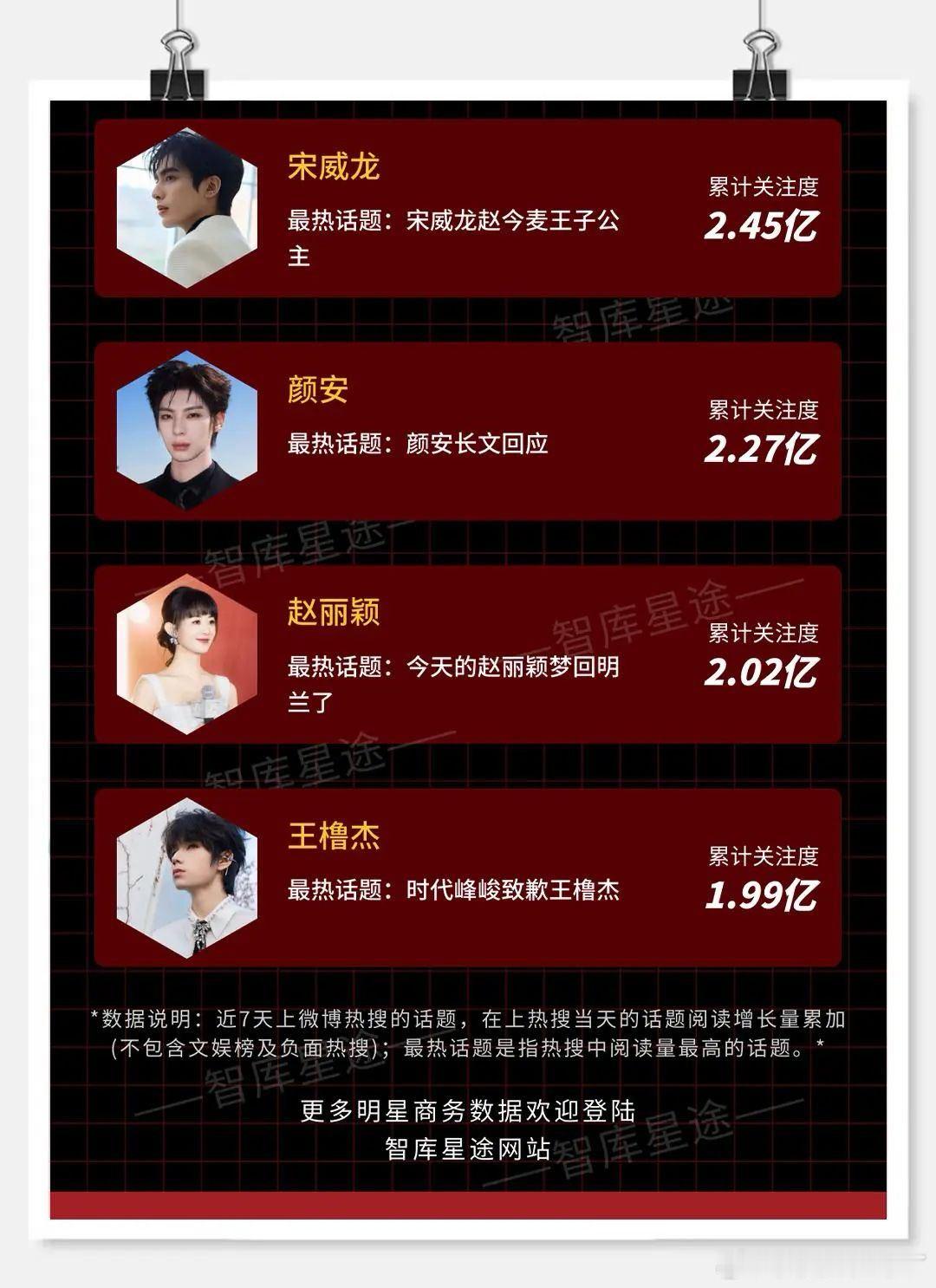 智库星途 近期热门话题人物统计时间 2026年0109-0115檀健次 肖战 赵今麦 宋威龙 颜安 赵丽颖 王橹杰