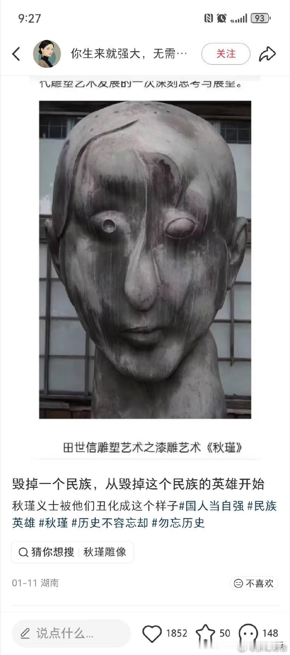 这是秋瑾?别侮辱英烈了!鉴湖女侠的傲骨铮铮,岂容被扭曲成这般怪诞模样!这是艺术?别侮辱艺术了!美学的殿堂从不是猎奇搞怪的秀场,更不是亵渎英雄的遮羞布!这般不伦不类的雕塑,究竟是何等扭曲的心理才能雕琢而出?英烈风骨岂容践踏,艺术底线更不可破!