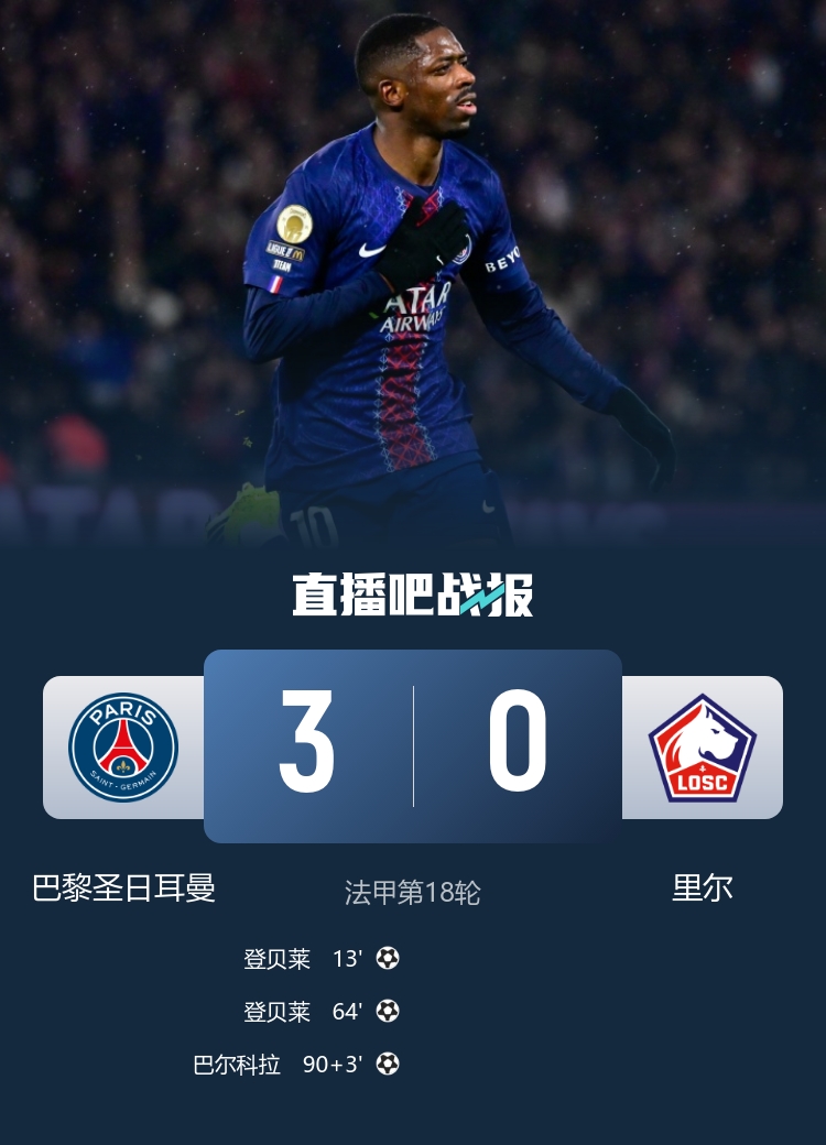 法甲第18轮,巴黎圣日耳曼3-0战胜里尔,登贝莱梅开二度,巴尔科拉进球。