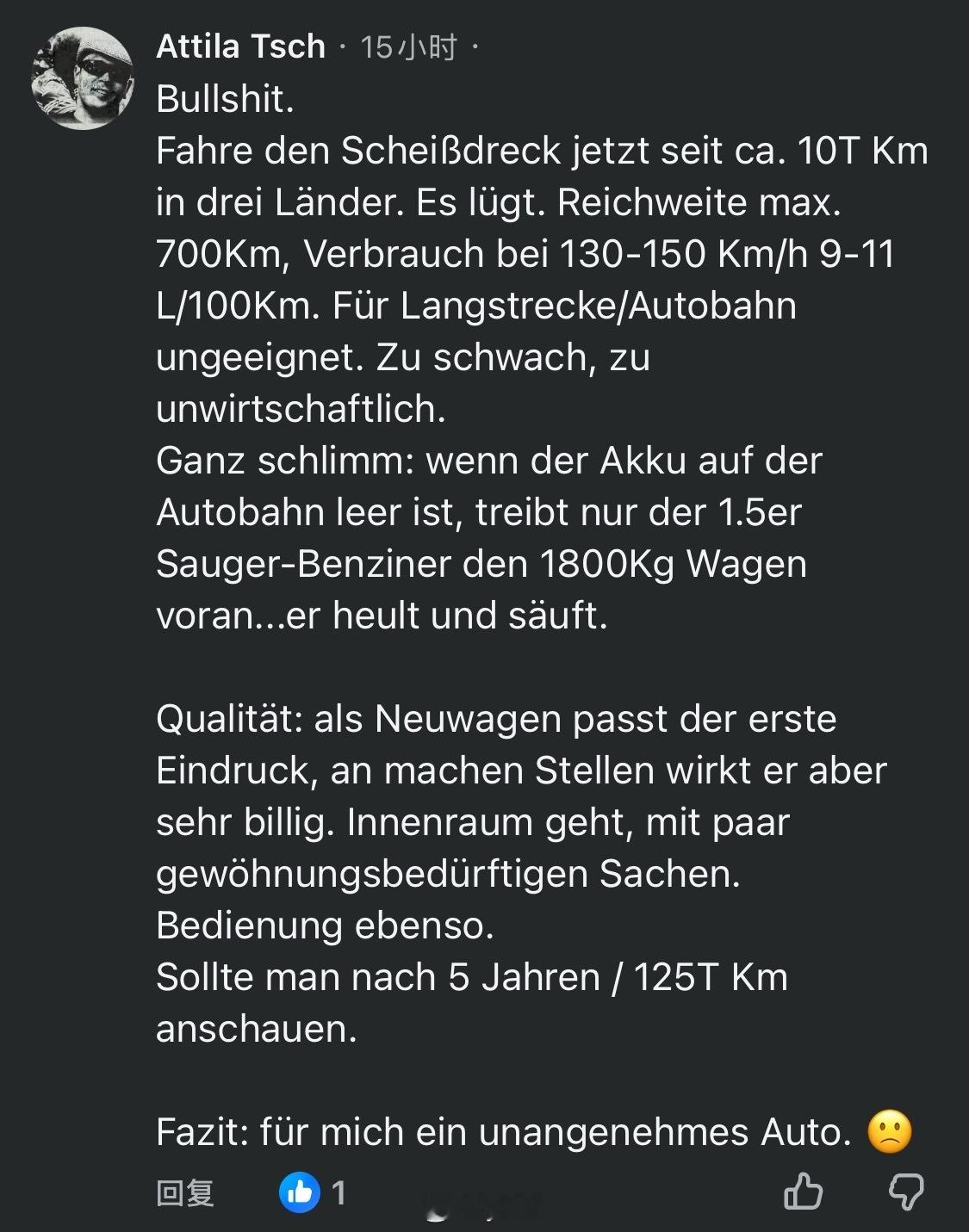 比亚迪海豹06旅行版真实车主反馈:扯淡。这破玩意儿我已经在三个国家开了大约 1 万公里。宣传是假的。最大续航也就 700 公里,130–150 km/h 的油耗 9–11 L/100 km。不适合长途/高速,动力太弱,经济性也差。最糟糕的是:高速上电池一旦没电,只剩下 1.5L 自然吸气汽油机 推着 1.8 吨 的车往前走……发动机吼得要命,还特别费油。质量方面:新车第一眼感觉还行,但有些地方显得很廉价。内饰还可以,但有些设计需要适应;操作逻辑也是如此。可能得等 5 年 / 12.5 万公里之后再看。结论:对我来说,这是一辆让人不舒服的车。🙁如果他说的是真的,那这1.5的自吸玩意高速油耗比很多3.0T的车都高……yz77聊车