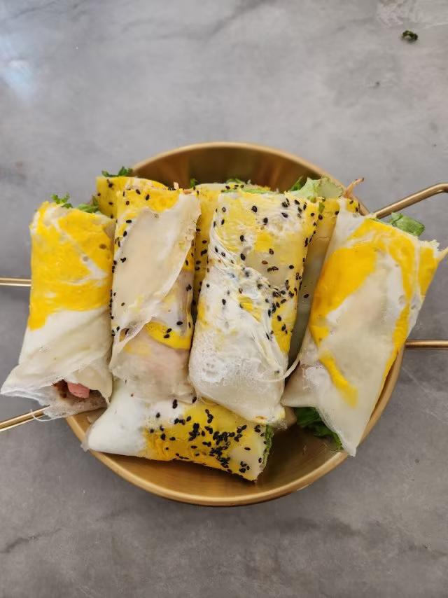今日早餐 鸡蛋面饼夾菜: ''鸡蛋面饼夾菜''是我起的名字,请不要见笑。其实,我做的鸡蛋饼夾菜很简单,先将搅好的面液倒入锅中,使其略有凝固,再倒入鸡蛋液做成饼,撒上黒芝麻。然后卷入生菜叶、火腿肠、胡萝卜🥕丝等。这个鸡蛋面饼夾菜的吃法就做好了。每人再配上一碗热乎乎的奶粉就可以开吃了。 是不是营养又美味呢,请友友们评论区评论一下吧!