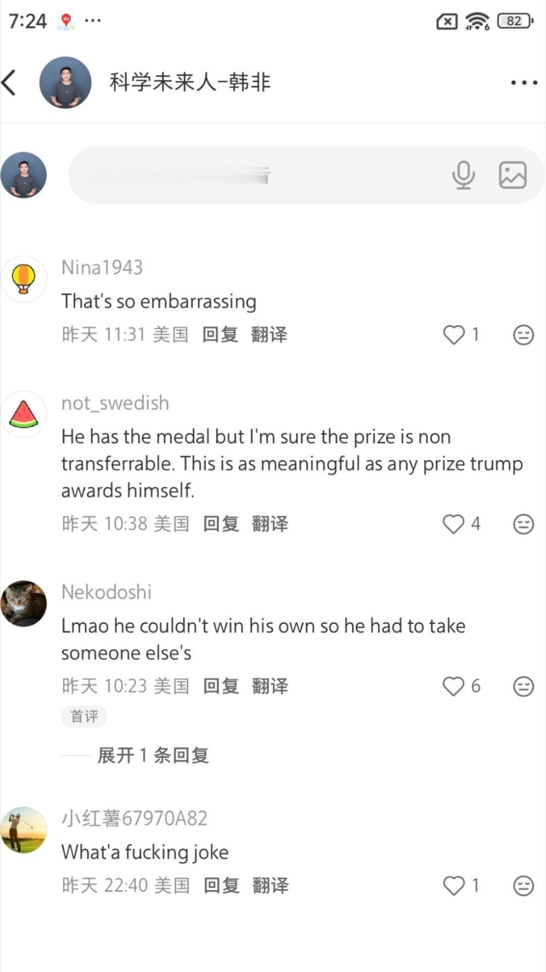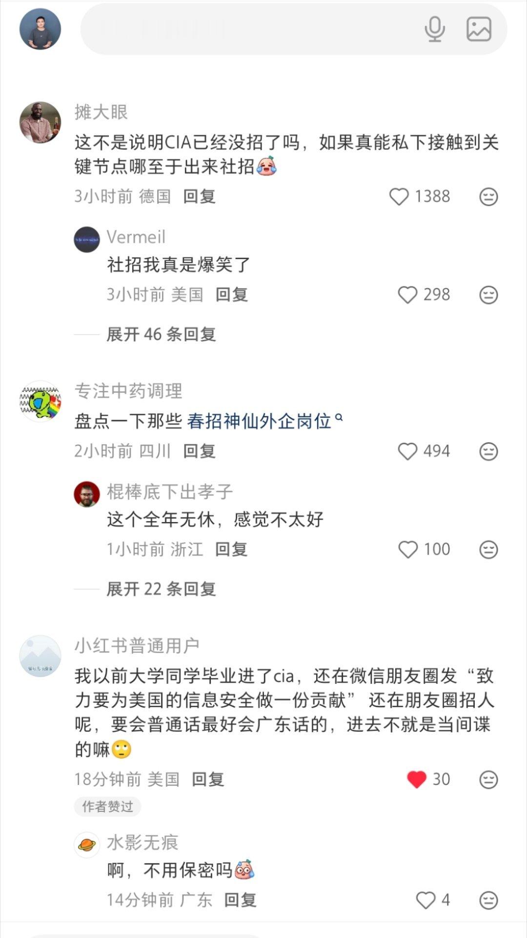 美前高官批特朗普收诺贝尔奖可耻我在只有18个粉丝的小红书账号发了这条新闻,居然吸引到美国人的评论!¹ 我老婆老说小红书推流算法不一样,果然。² CIA发的招募中国普通人视频(“社招”),在小红书和微博都发了。微博上讨论寥寥,但小红书上居然爆了!刚醒来发现评论区一多半都是外国ip。重点是一个美国ip分享:“我以前大学同学毕业进了cia,还在微信朋友圈发“致力要为美国的信息安全做一份贡献” 还在朋友圈招人呢,要会普通话最好会广东话的,进去不就是当间谍的嘛🙄”。热点科普