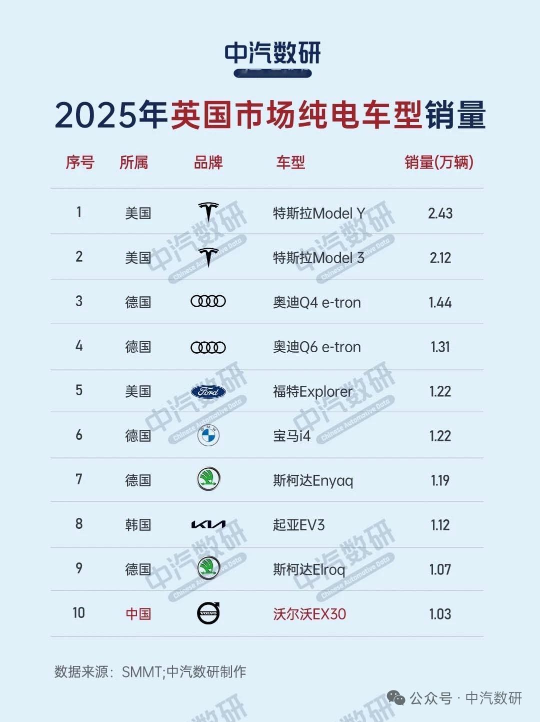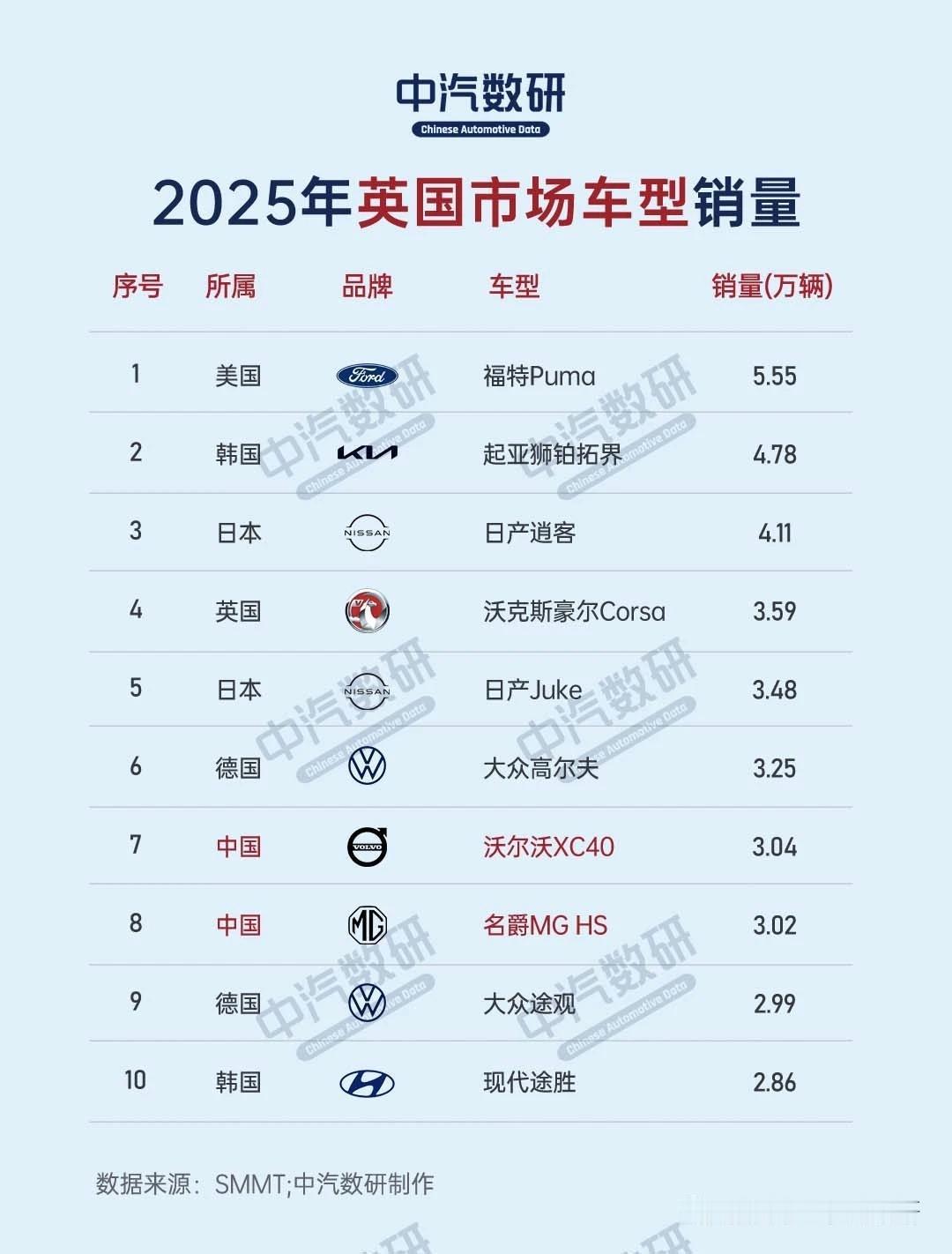 2025年英国汽车销量排行榜已经出炉,咱们盘点一下: 品牌榜前10,中国MG排在第10位,卖了8.8万辆,份额4.2%,差不多是德国大众定位一半。德国的大众、宝马、奥迪、奔驰,都进入了前十。日系丰田、日产上榜。 车型销量,进榜的中国车型有沃尔沃XC40,名爵MG HS。 纯电车型销量榜,进榜的是沃尔沃EX30。 车型层面咋评价呢,比亚迪2025年在英国卖了5.1万辆,同比大幅增长,算是让英国人感受到了中国汽车工业的风采。【来自懂车帝车友圈】