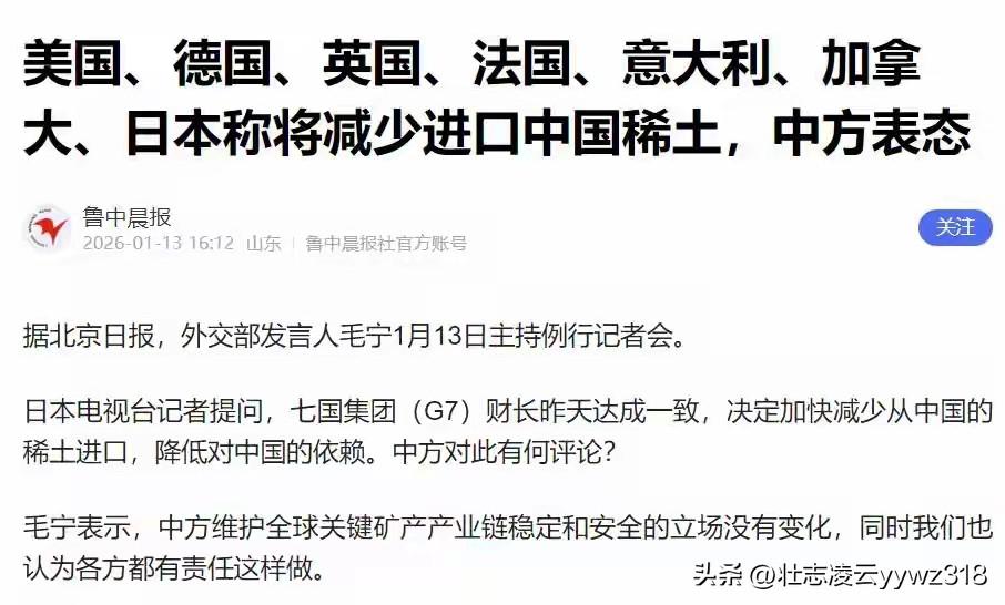 G7玩脱了!撤无人机禁令当幌子,稀土脱钩纯属自讨苦吃 2026开年最讽刺的戏码,当属G7自导自演的“产业链脱钩”闹剧!1月9日美国突然撤销对华无人机禁令,转头就拉着G7财长密谋稀土脱钩,这波声东击西的操作,简直把“自欺欺人”玩到了新高度! 谁不知道美国民用无人机市场80%都是中国货?禁令才实施一年,美国农户买植保无人机得多掏30%溢价,相关行业直接亏了20多亿美元。可民用无人机的稀土用量才占全球2%,对美国根本没战略影响,撤销禁令不过是安抚国内的“缓兵之计”。他们真正盯上的是稀土——这“工业维生素”能撑得起军工、新能源,可中国握着全球90%的精炼产能,分离纯度能到99.9999%,美国本土加工成本是咱们的3倍多,良率还低一大截。 更让人哭笑不得的是,澳洲莱纳斯公司喊着“去中国化”,挖走中国工程师也搞不定量产,70%的稀土精矿最后还得乖乖运到中国加工;G7扬言要砸2000亿美元重建产业链,可光培养一名稀土分离工程师就得5年,整个产业链建起来至少要10年,纯属纸上谈兵。咱们早就不是卖原料的初级玩家,全球7成新能源汽车的永磁电机都用中国稀土材料,这话语权可不是靠开会就能抢走的。 G7以为靠抱团就能绕开中国,却忘了核心技术和完整产业链不是一朝一夕能复制的。你觉得他们最后会不会偷偷回头求中国合作?