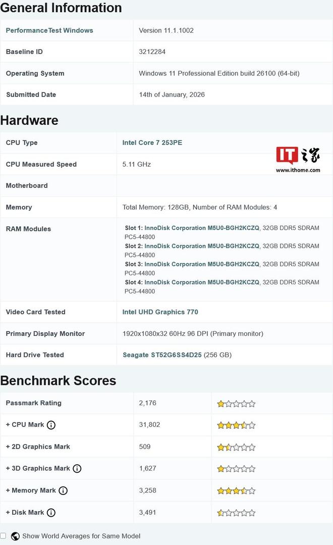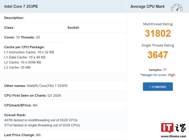 IT之家1月17日消息,PassMark基准测试数据库现已记录到了英特尔酷睿7253PE处理器。从其10核心20线程的设计来看,这应该就是面向边缘与嵌入式领域的"BartlettLake12P"系列纯性能核(纯P核、纯大核)处理器的一员。