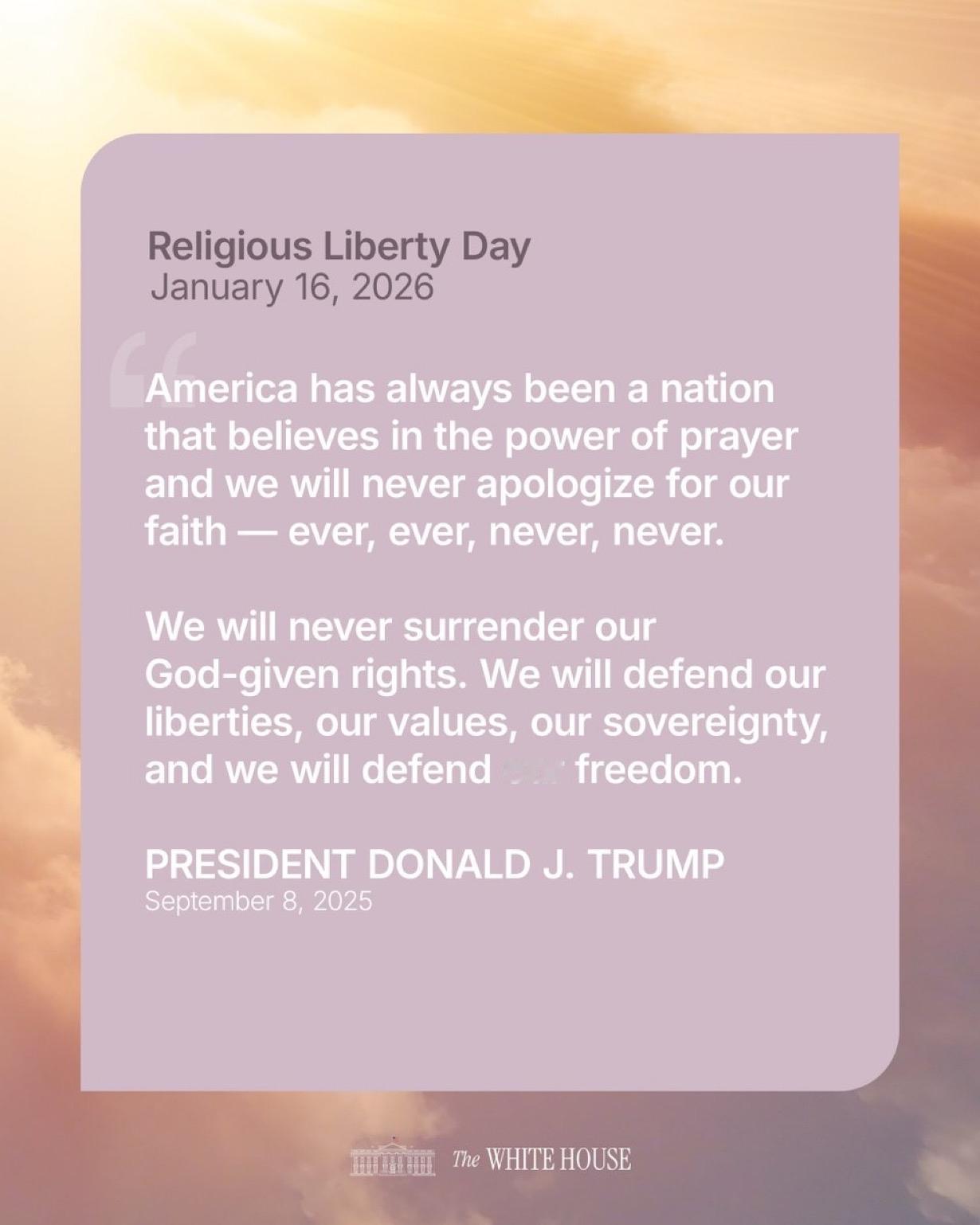美国白宫: “在特朗普政府的领导下,我们永远不会为我们的信仰道歉,我们永远不会放弃上帝赋予我们的权利,我们将永远捍卫我们的自由。 宗教自由日快乐🕊️”
