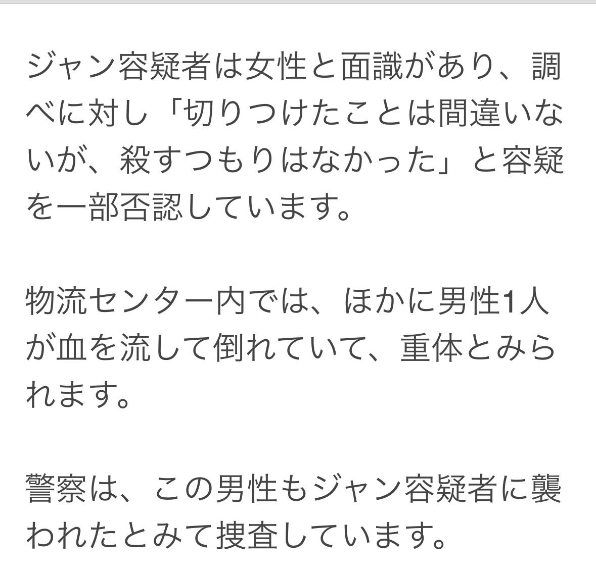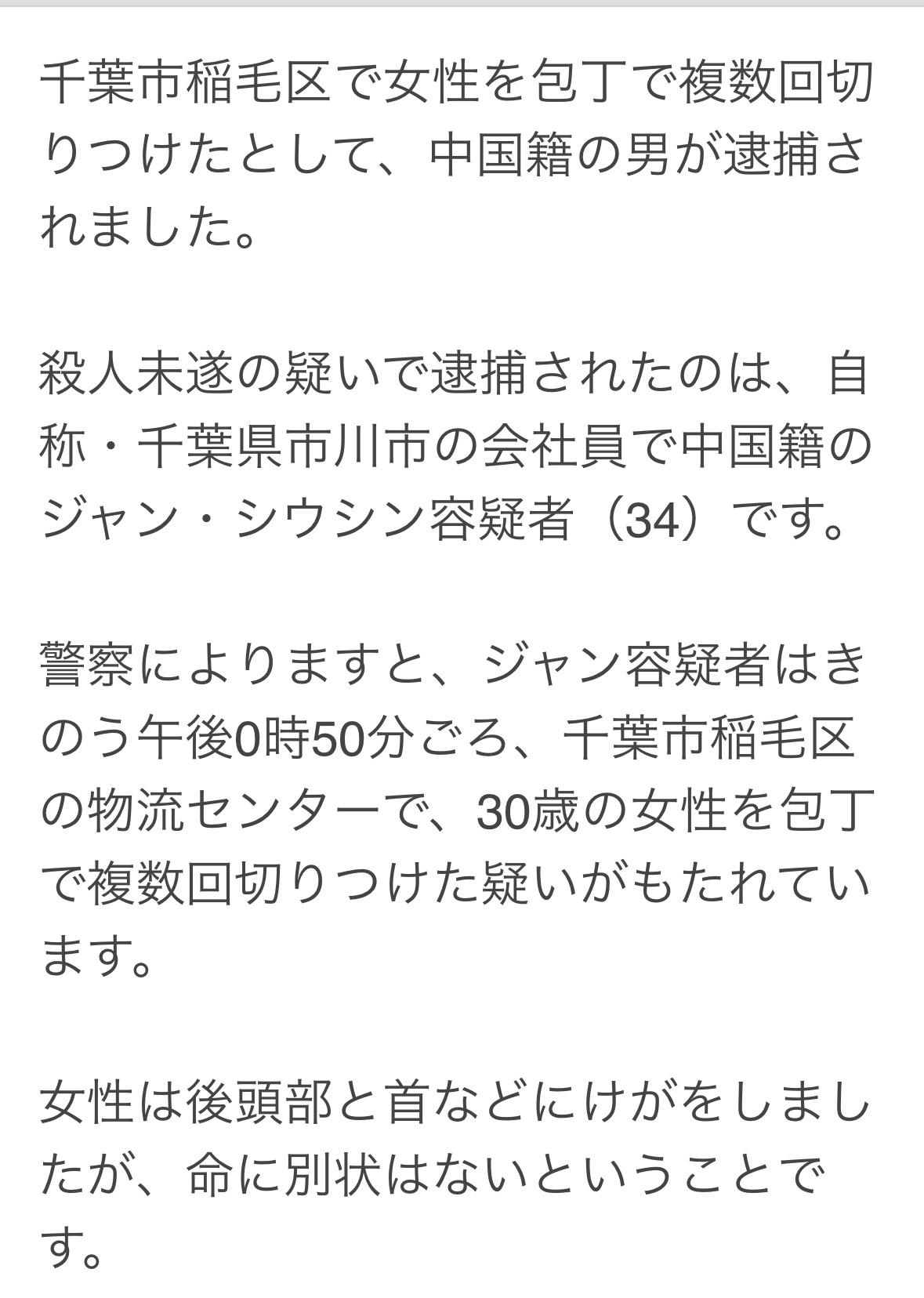 34岁中国男子在千叶县千叶市物流中心持刀砍伤两人。受伤女子30岁头部颈部受伤,无