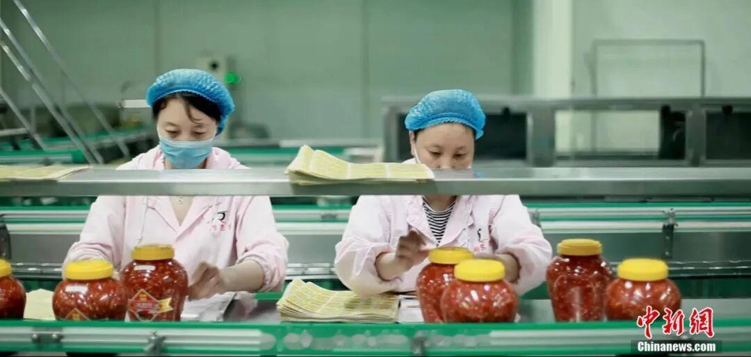 图为鸡泽县辣椒加工企业工人正在给罐装好的剁椒贴标签。中共鸡泽县委宣传部供图
