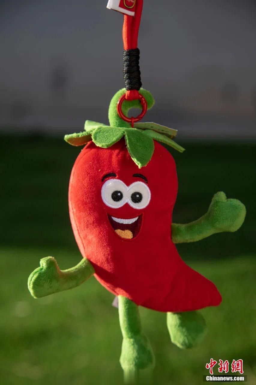 文创摊位上,红红的小辣椒有着绿色的“帽子”和四肢,它咧着嘴笑想和人们“椒”个朋友,手脚向外伸展,好像正在欢快地跳跃。